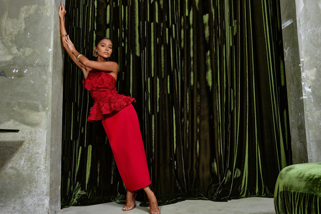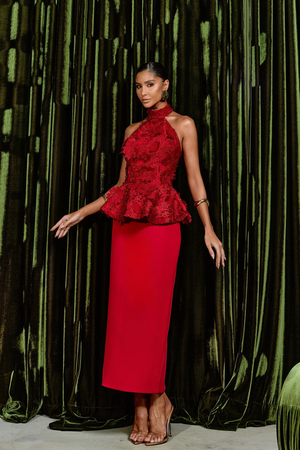 elegant set features a beautifully crafted guipure lace top adorned with 3D floral appliqués, adding depth, texture, and a luxurious touch. The peplum silhouette enhances the waistline, creating a feminine and refined shape. Paired with a matching midi skirt, the look is sophisticated and harmonious, perfect for special occasions, celebrations, or events where elegance and craftsmanship stand out.