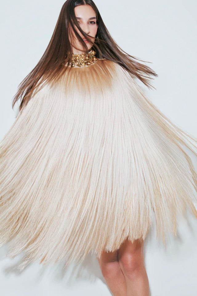 This dress is crafted from textured knit fabric, featuring a fitted silhouette that enhances the figure with elegance and sophistication. The design is elevated by delicate fringe appliqués that add movement and a contemporary touch.