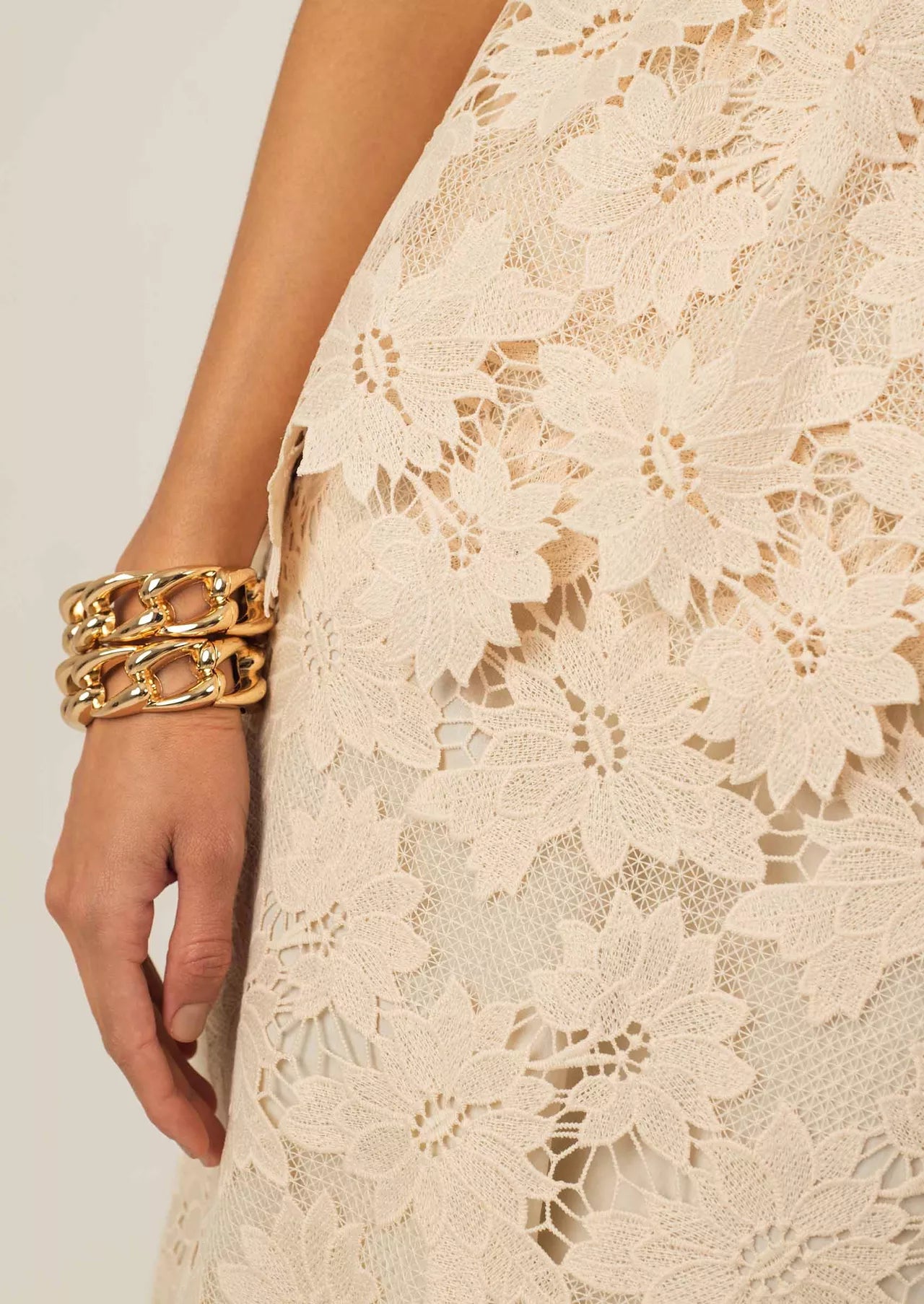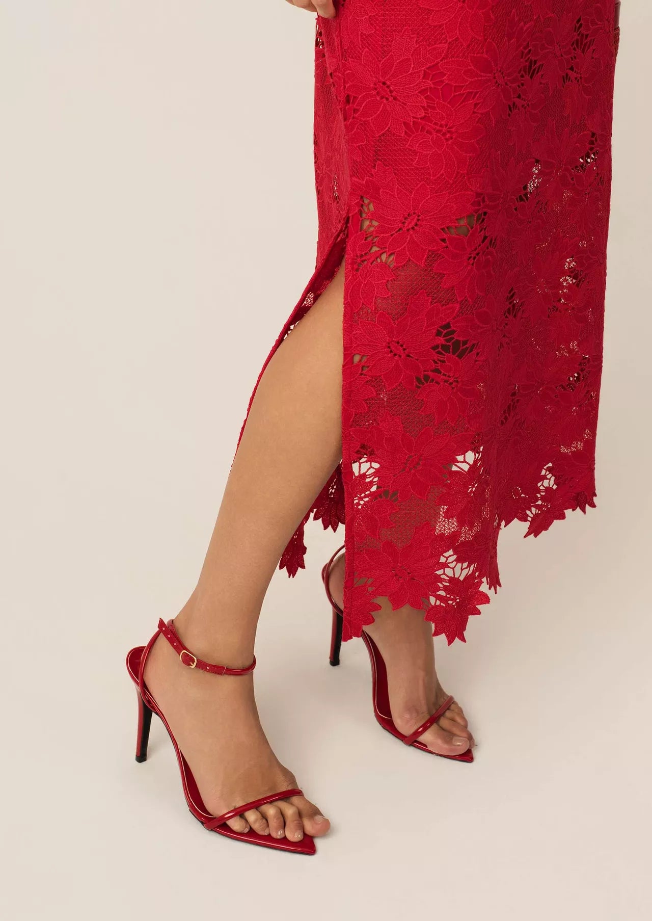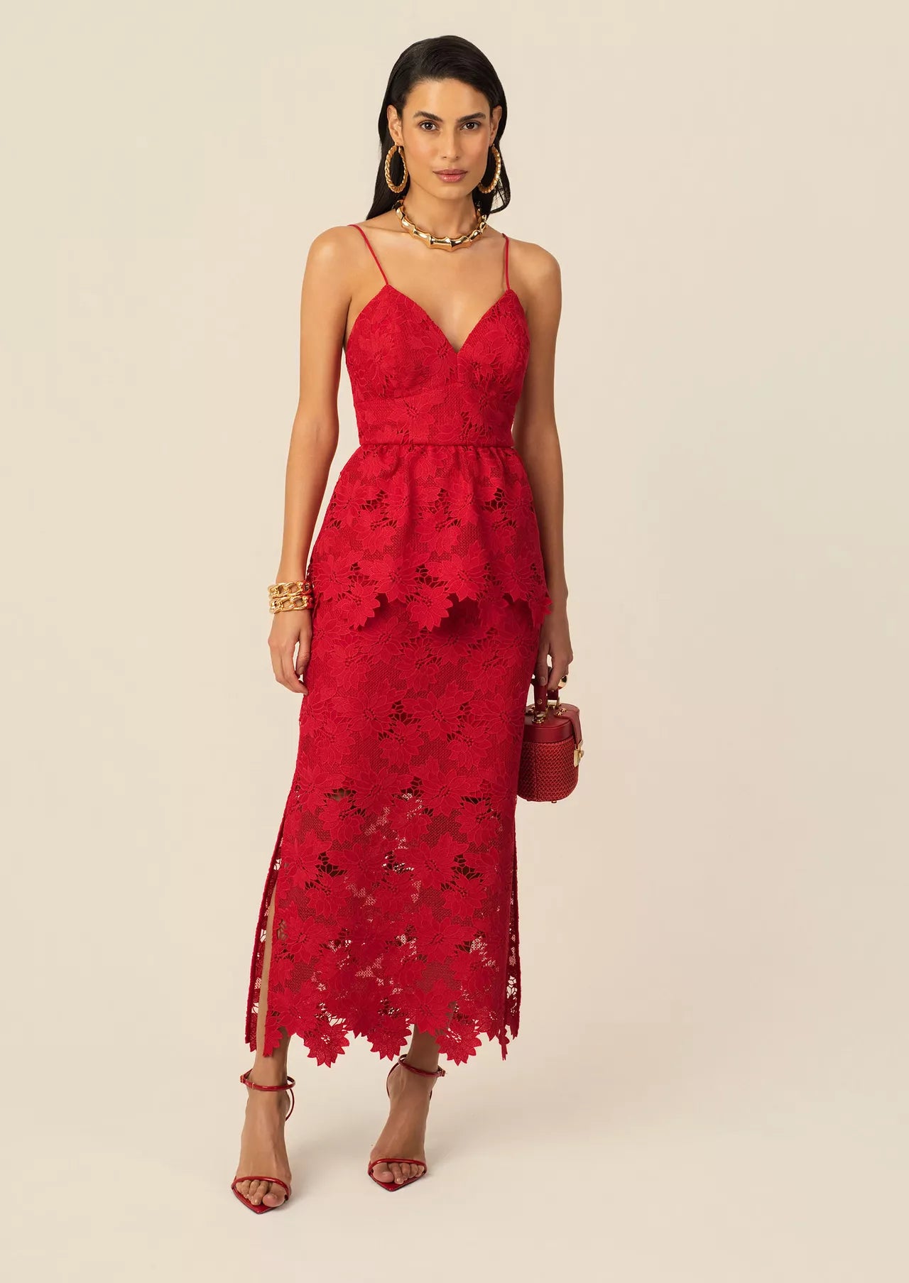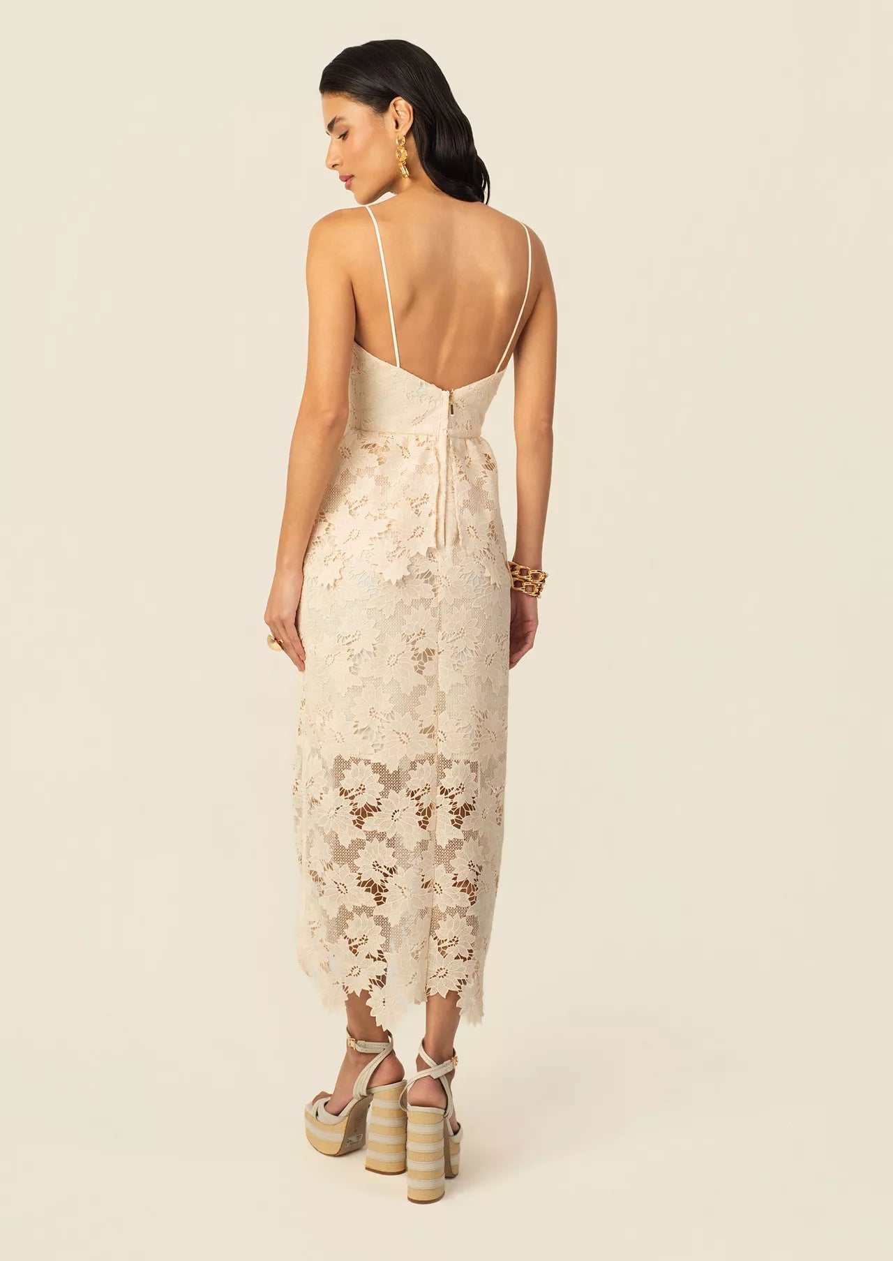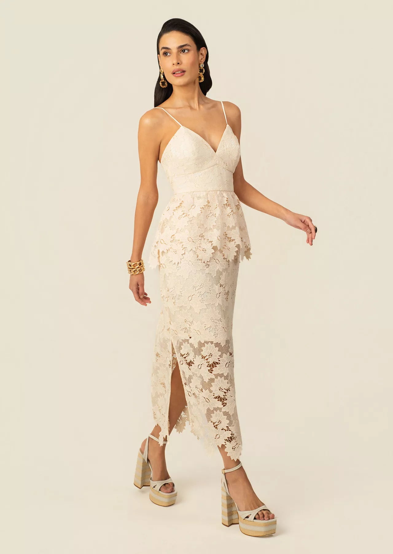 With its straight silhouette and defined waist, the Aruba midi dress embodies a soft yet sophisticated femininity. The V-neckline beautifully enhances the neckline, while the peplum featuring floral edges sculpted from the lace itself adds movement and artisanal charm to the design. A subtle side slit brings modernity and ease of movement, perfectly balancing elegance and freshness. The back metal zipper closure completes the piece with a refined finish.