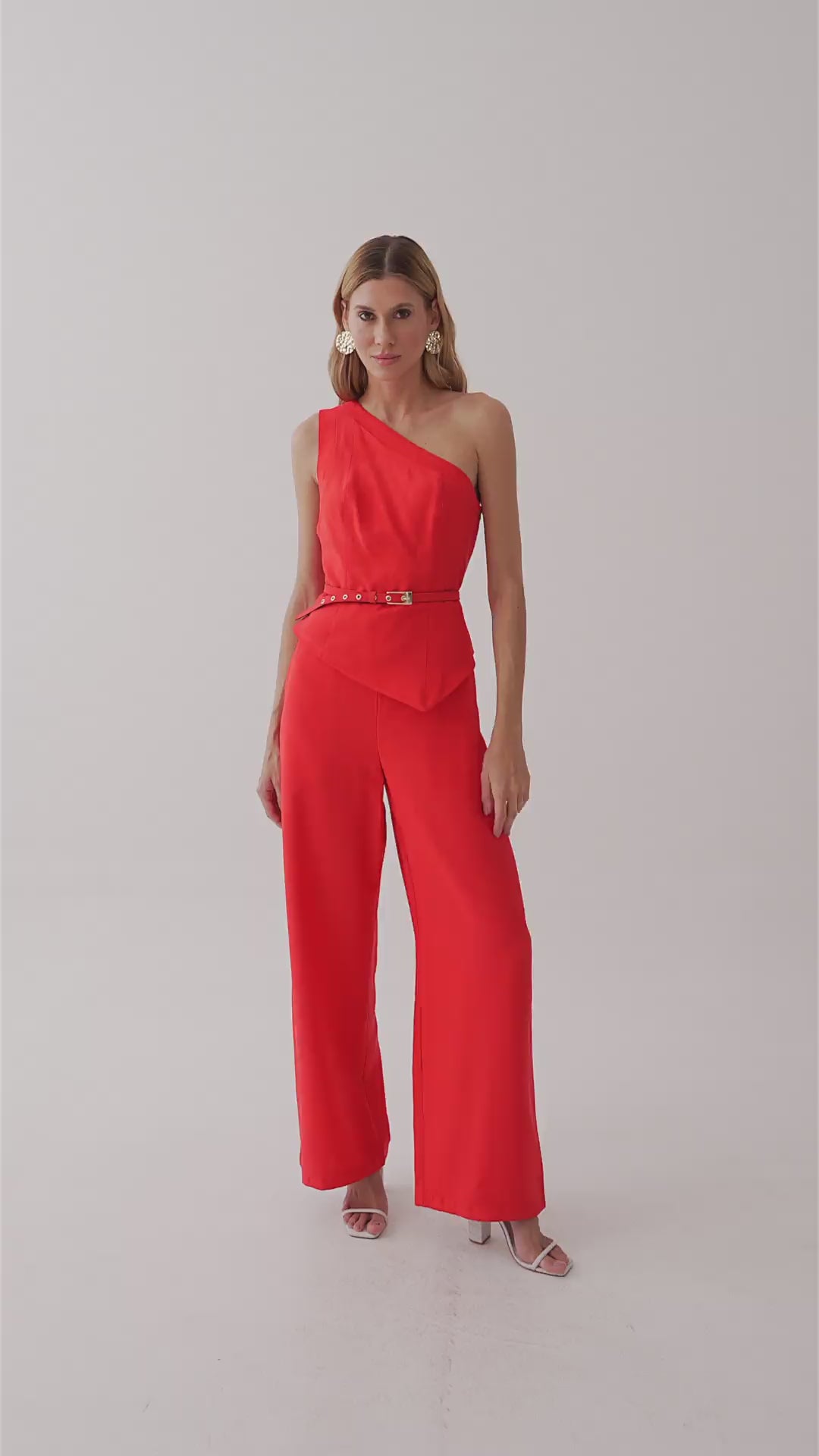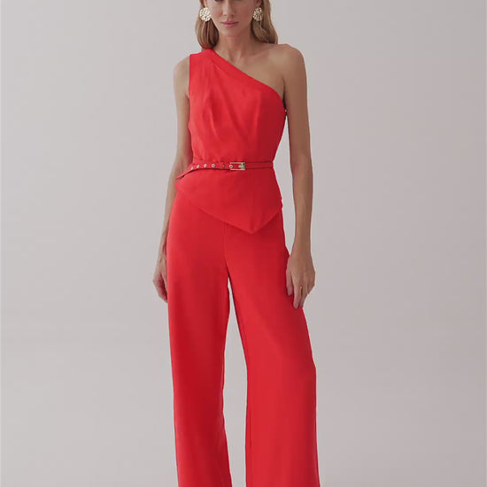 This elegant long jumpsuit is crafted from a viscose-blend fabric with a tailored finish that enhances its structured silhouette. Featuring an asymmetrical neckline for a modern and sophisticated touch, it comes with a matching belt that cinches the waist and highlights the figure. The wide-leg design adds fluidity and movement, making it perfect for both formal and evening occasions. A refined piece that combines comfort, style, and timeless elegance.