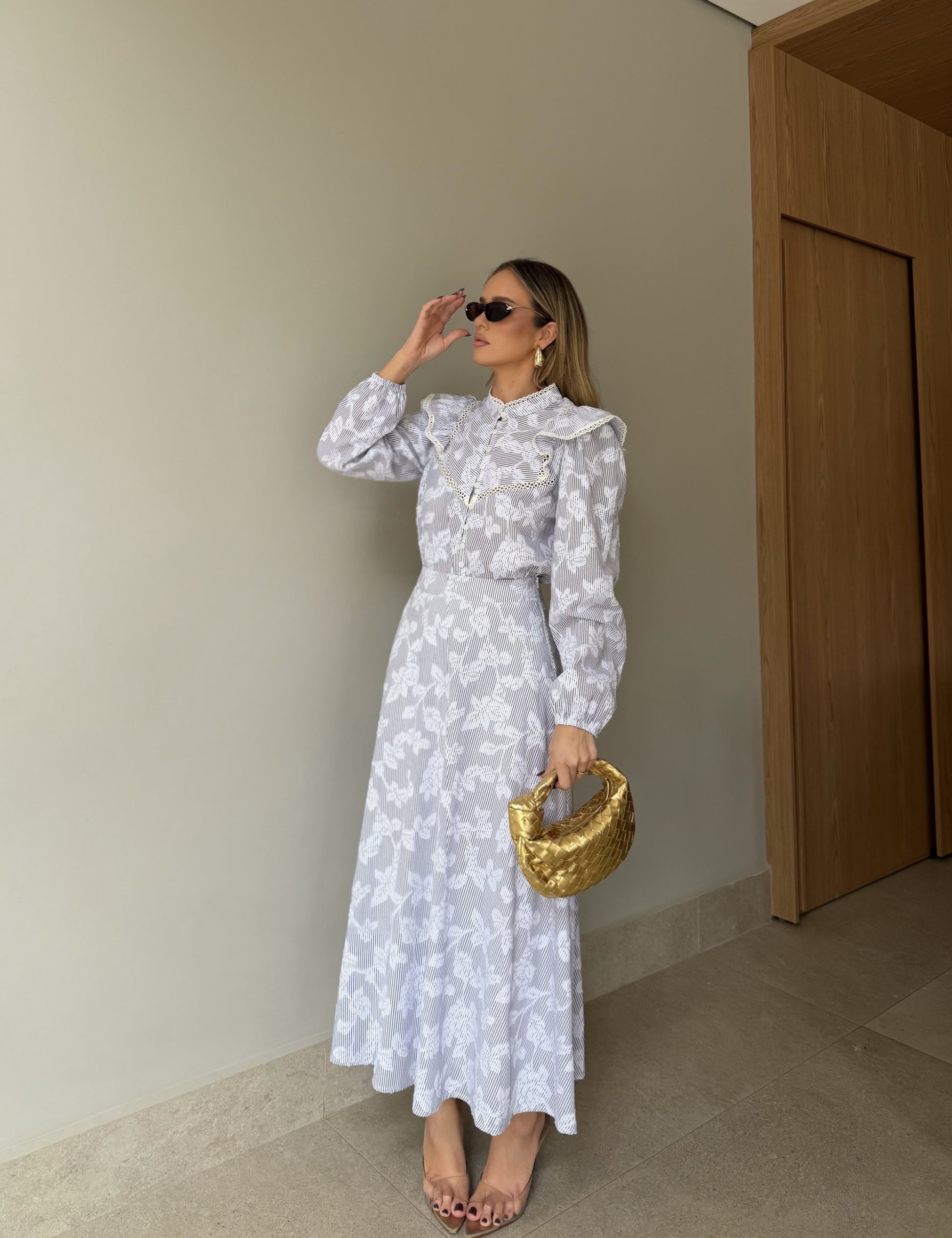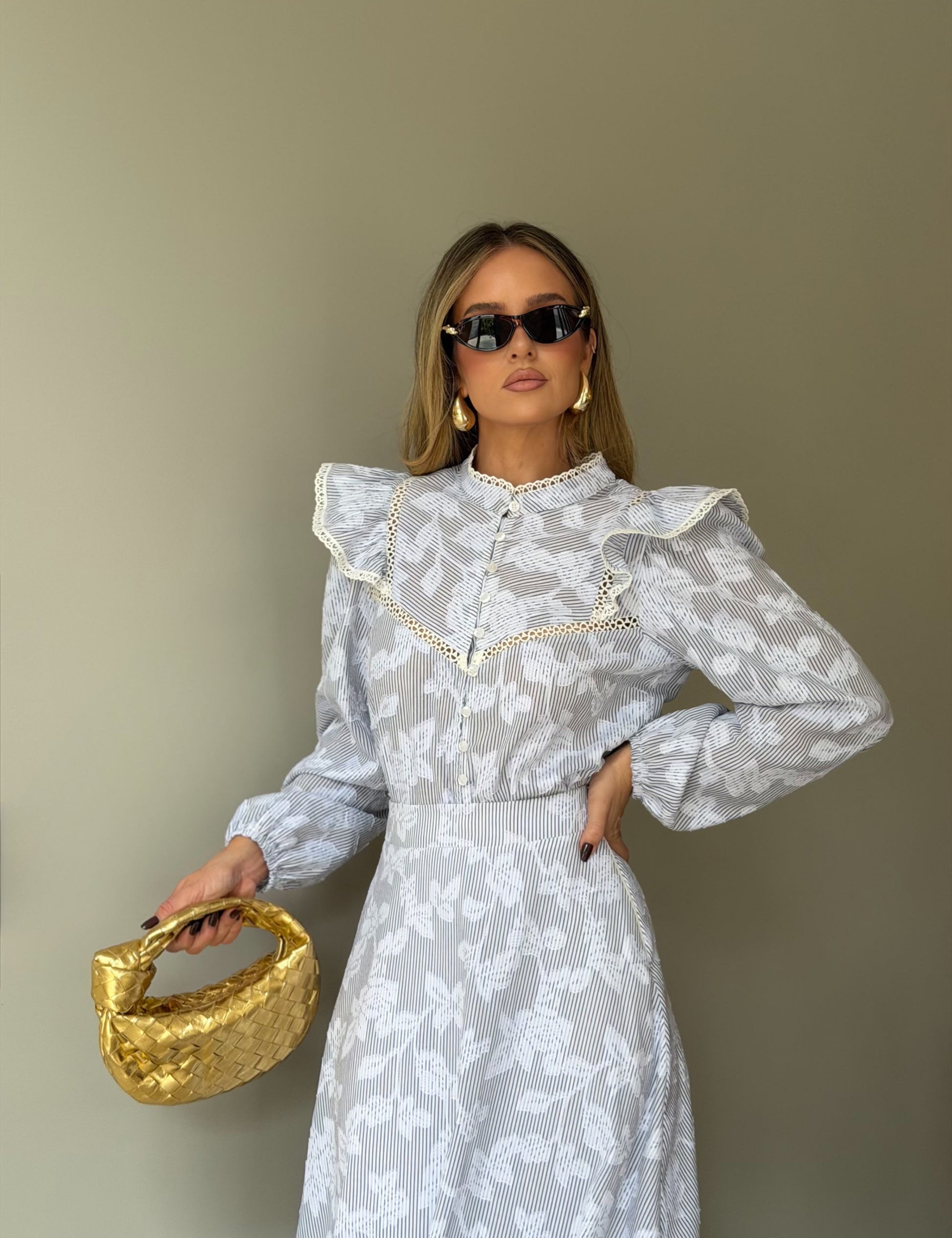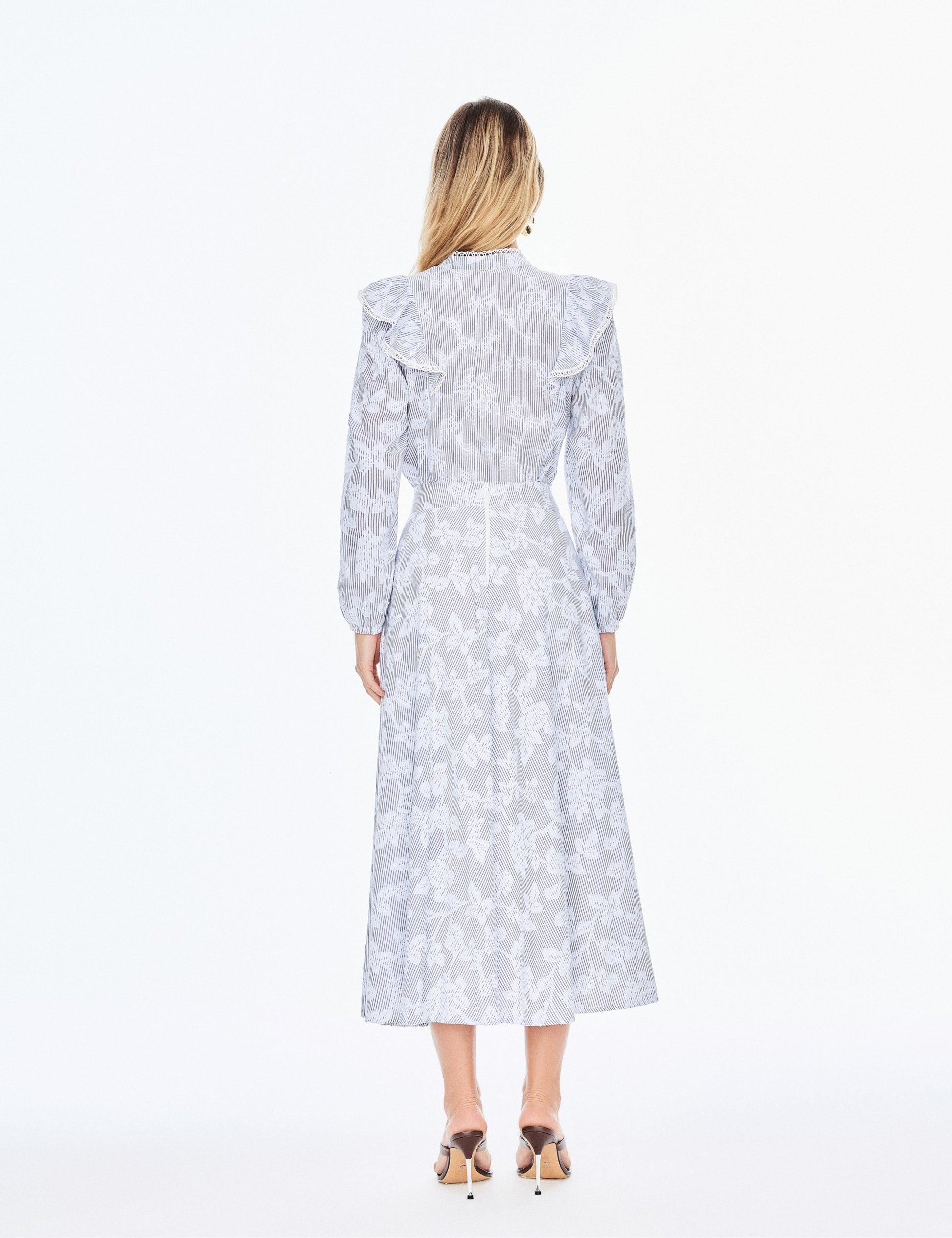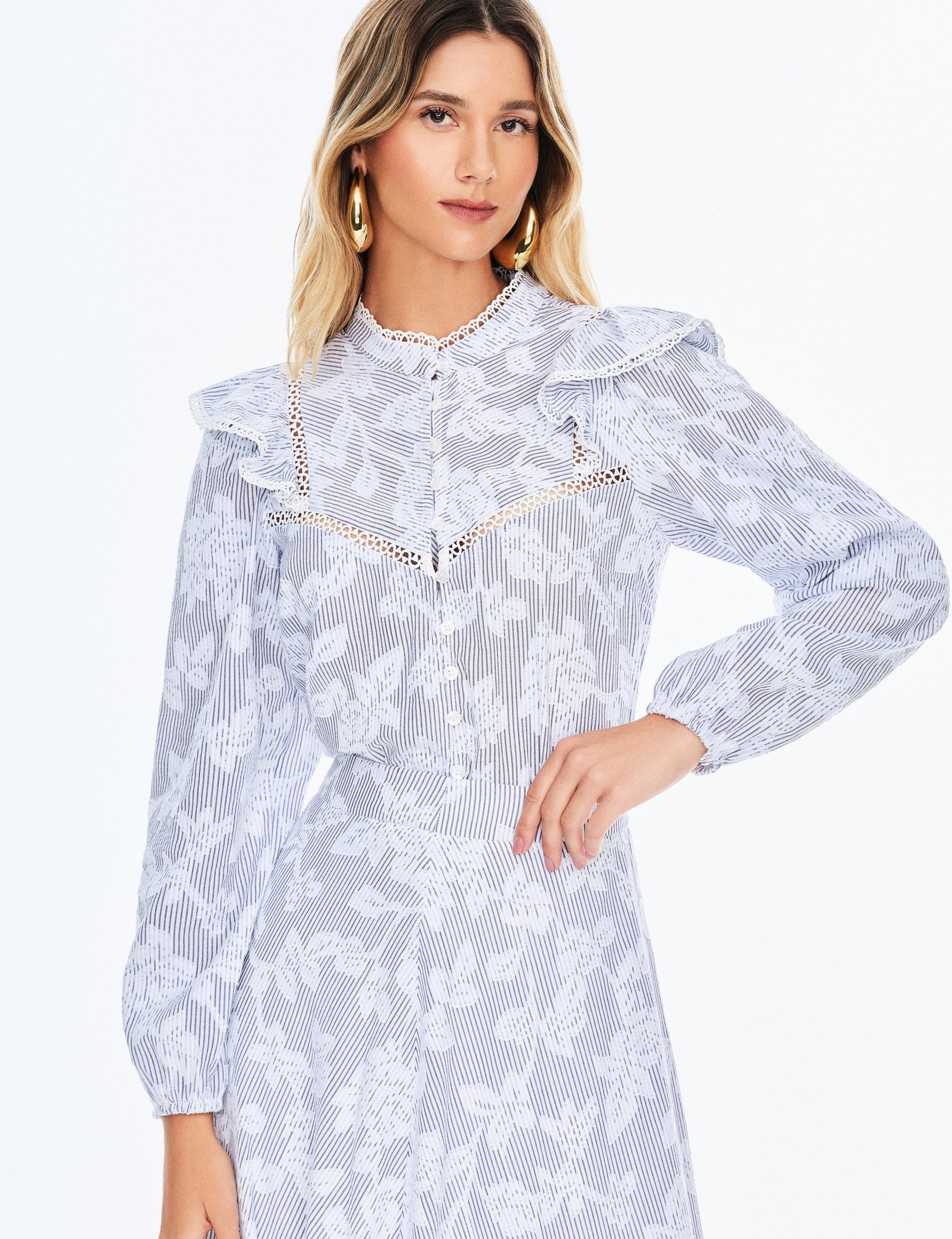 Romantic with a contemporary twist, this shirt is crafted from a striped cotton-blend fabric enhanced with a delicate floral devoré effect, creating subtle texture and visual depth. The design merges classic tailoring with feminine detailing, making it a standout piece for refined styling.The long sleeves and structured shoulders bring a polished, modern silhouette, while the bust is enriched with a mix of openwork lace inserts that add lightness and sophistication. A soft ruffled trim in scalloped lace further elevates the look, adding movement and a romantic finish.