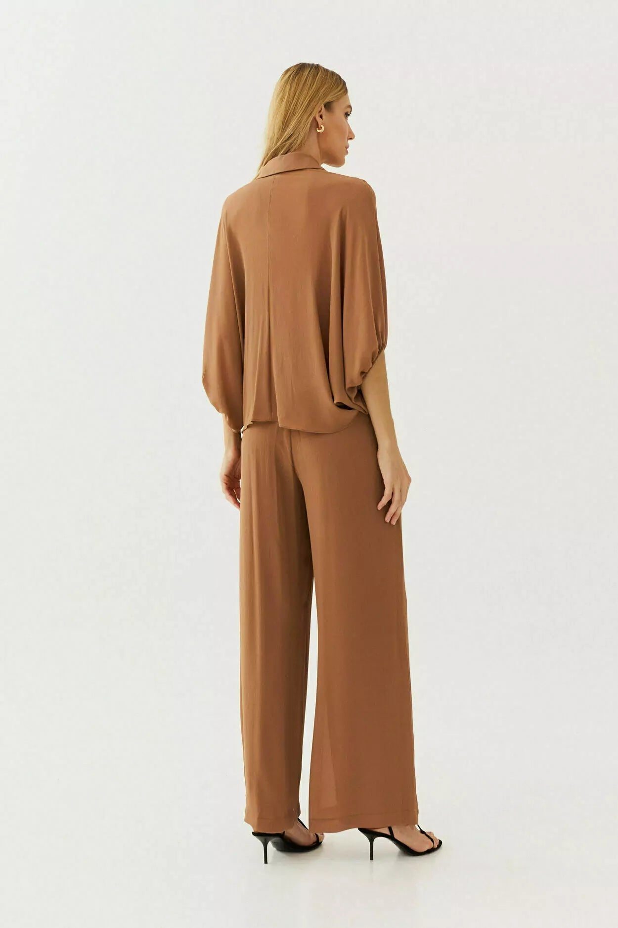 Elegant chiffon set composed of a batwing-sleeve blouse and wide-leg pants. The blouse features delicate gathers along the neckline, creating a soft and fluid drape that enhances its sophisticated look. The pants have a flattering high-waist design with side pockets, combining comfort and elegance for effortless style. Perfect for both daytime and evening occasions.