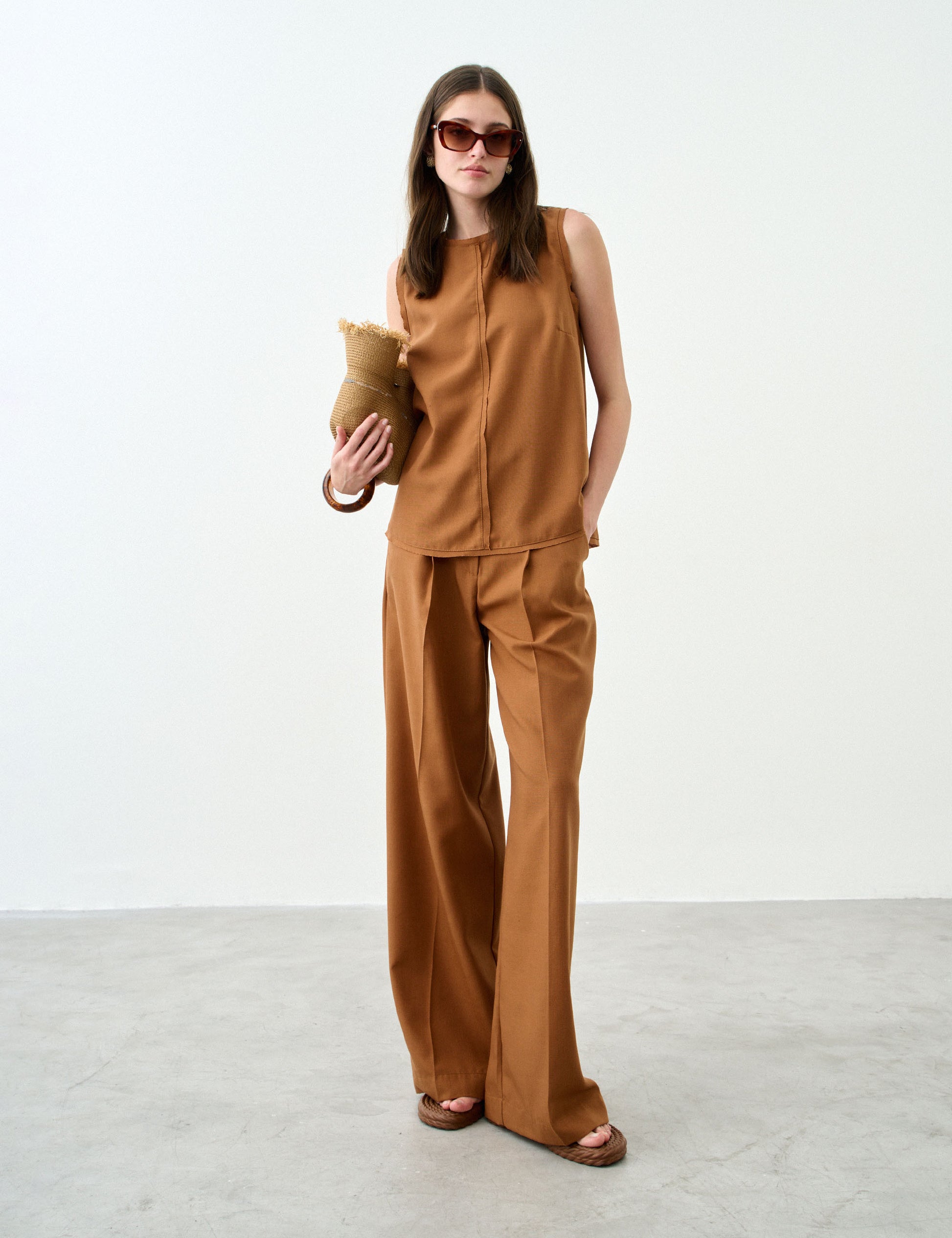 This set combines a sleeveless top and wide-leg trousers, crafted from a soft, structured fabric that offers both comfort and sophistication. Designed for versatility, it transitions seamlessly from casual to refined looks.