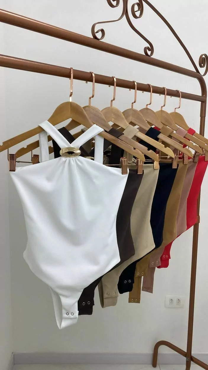 This bodysuit is crafted from soft polyamide fabric and features a halter neckline that fastens at the neck. The design stands out with an organic metal ring detail at the front, centered on the bust, adding a modern and sophisticated touch. Perfect for pairing with tailored pants, skirts, or shorts for an effortlessly chic look.