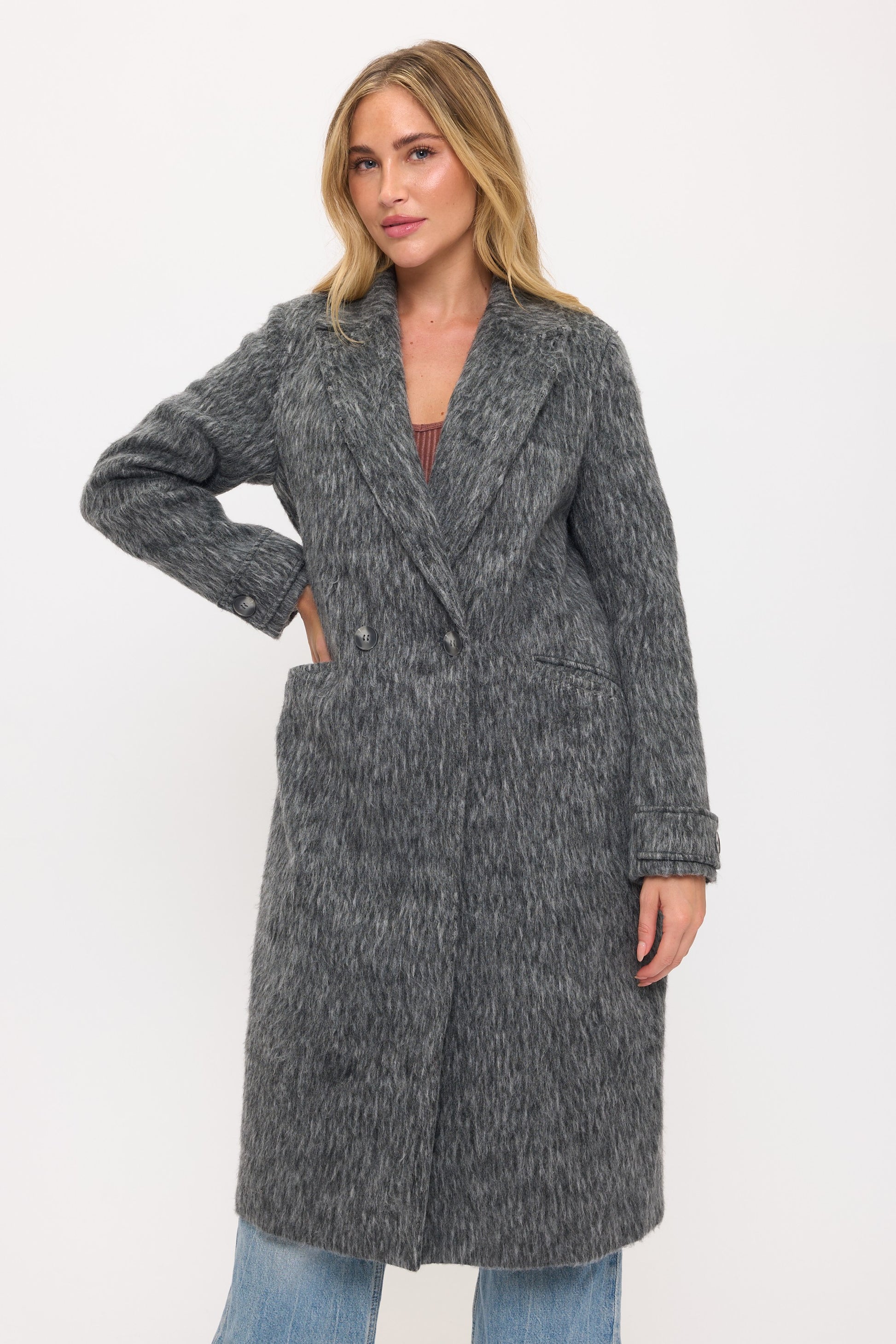 This luxurious oversized coat envelops you in sumptuous comfort with its plush, fuzzy wool blend texture that feels like wearing a cloud. The dramatic floor-length silhouette features classic tailored lapels and a sophisticated single-button closure that creates an elegant drape