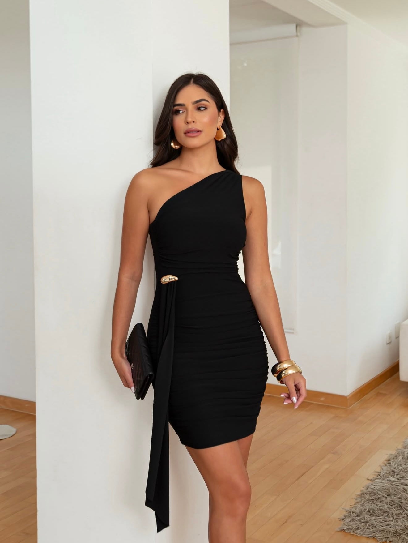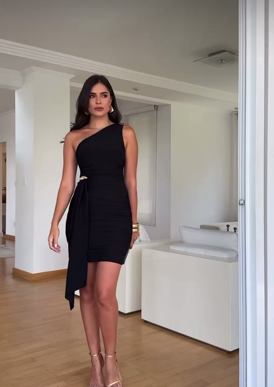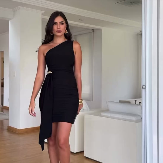 Turn heads with this stunning one-shoulder mini dress, crafted from stretch crepe for a sleek and comfortable fit. Featuring a draped waist detail accented with a gold embellishment, it enhances the silhouette with elegance and sophistication. Perfect for cocktail parties, date nights, or special occasions where style and confidence meet.
