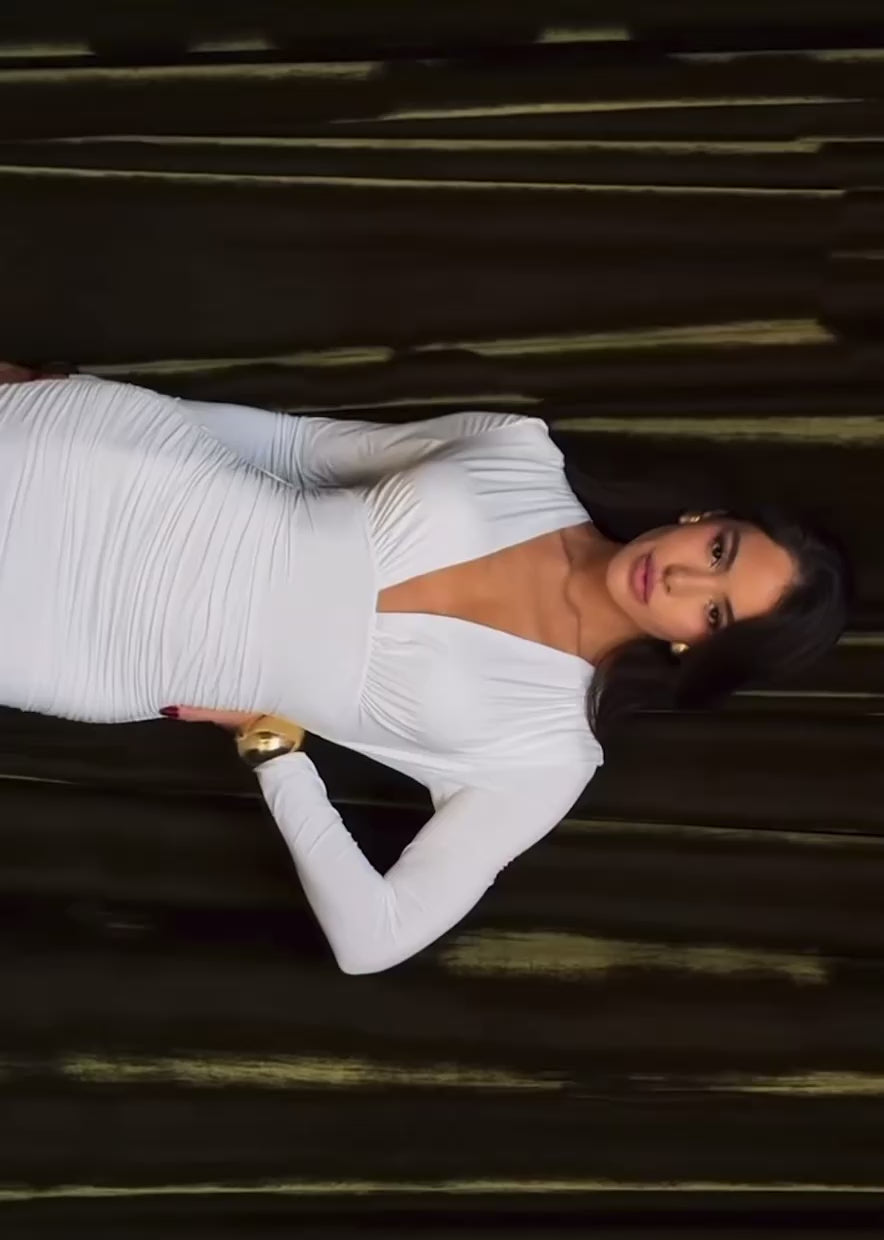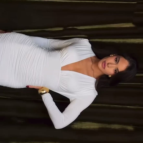 Exude sophistication with this stunning midi dress, designed to enhance your natural curves with elegance and confidence. Featuring a deep V-neckline and long fitted sleeves, it combines sensuality with refinement. The ruched detailing throughout the dress creates a flattering, body-contouring effect, while the soft stretch fabric ensures a perfect fit and comfort. Ideal for cocktail parties, evening events, or special celebrations.