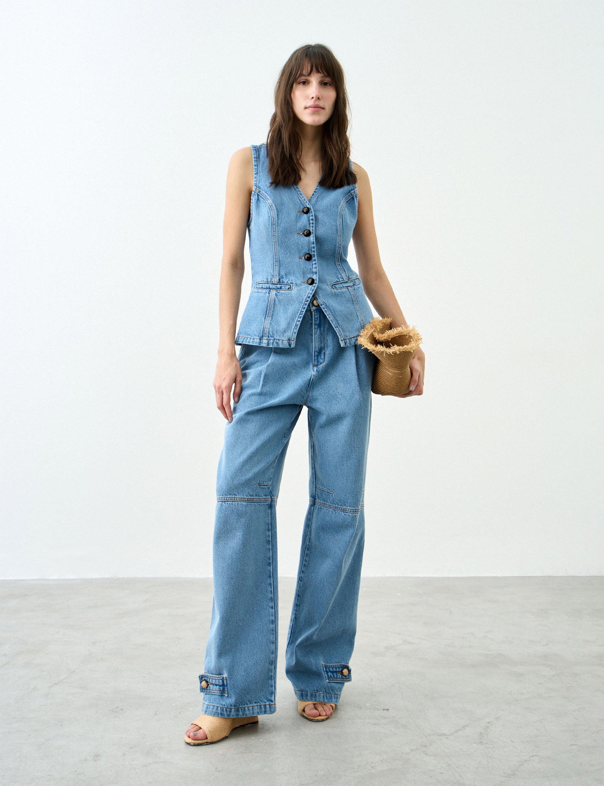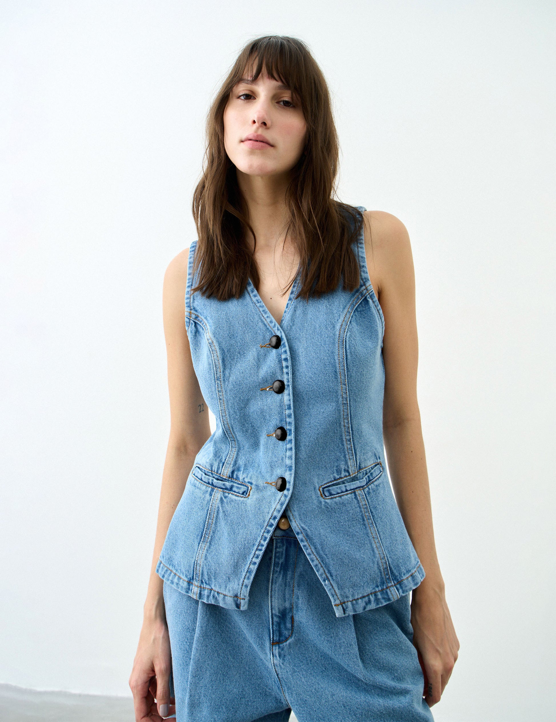 A wardrobe classic reimagined with a modern and feminine touch. Crafted from structured denim, this vest combines durability, comfort, and versatility in one timeless piece. The fabric offers a soft feel and a tailored fit that gracefully follows the body, bringing elegance with a lightweight touch.