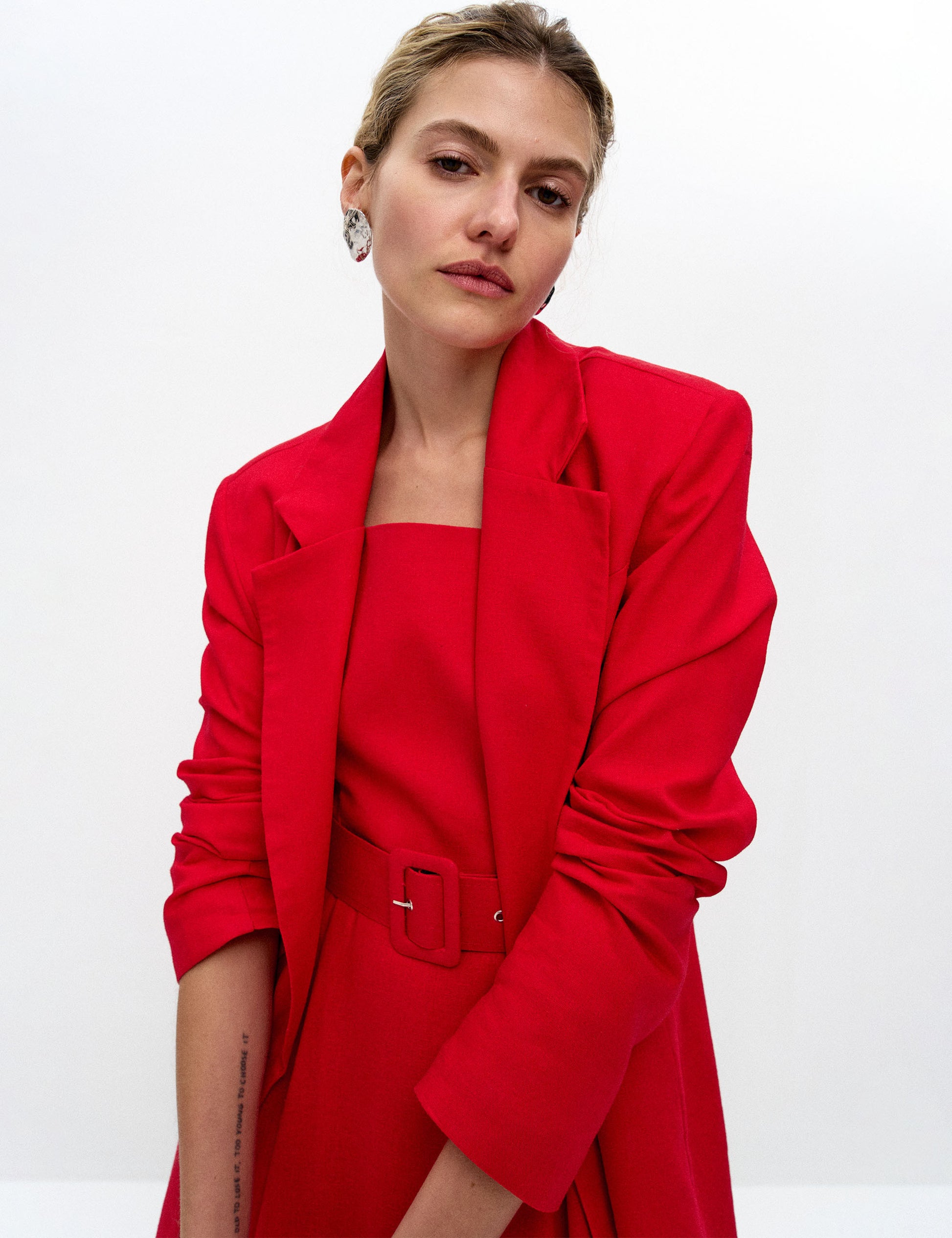 Crafted from a viscose-linen blend — a fabric that combines the lightness and comfort of viscose with the refined, natural texture of linen — this blazer is a timeless piece with a flawless fit. The elongated structure and full lining enhance the silhouette with elegance, while the subtle shoulder pads provide a refined finish and structured look.