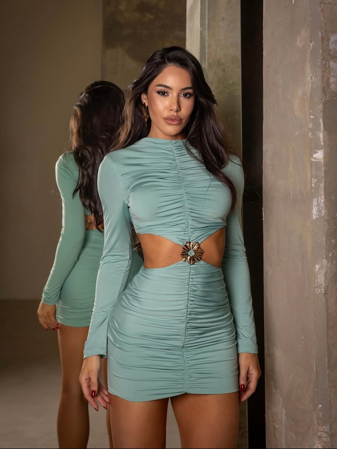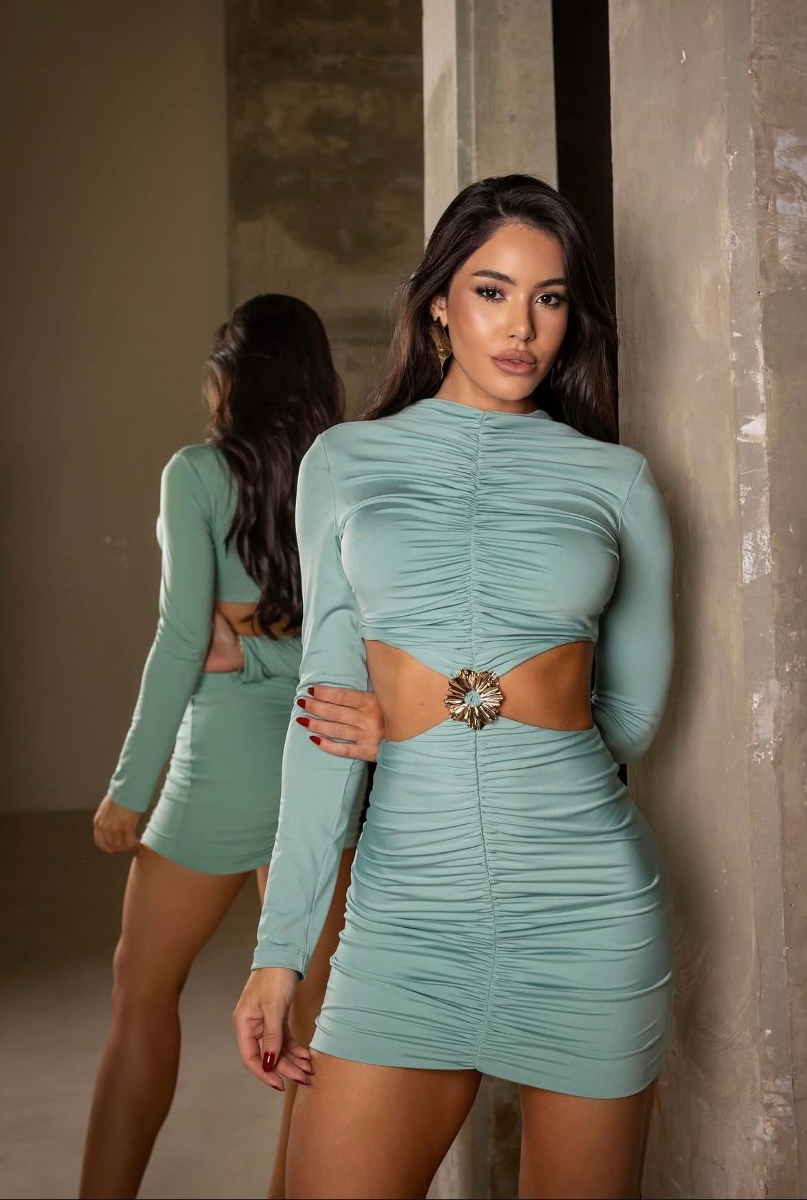 Chic and feminine, this short dress features long sleeves and a beautifully ruched design that enhances the silhouette. The waist cutout adds a modern touch, while the gold flower detail brings a hint of sophistication and glamour. Crafted from soft, stretch fabric for a flattering fit, this dress is perfect for parties, special dinners, or evening events.