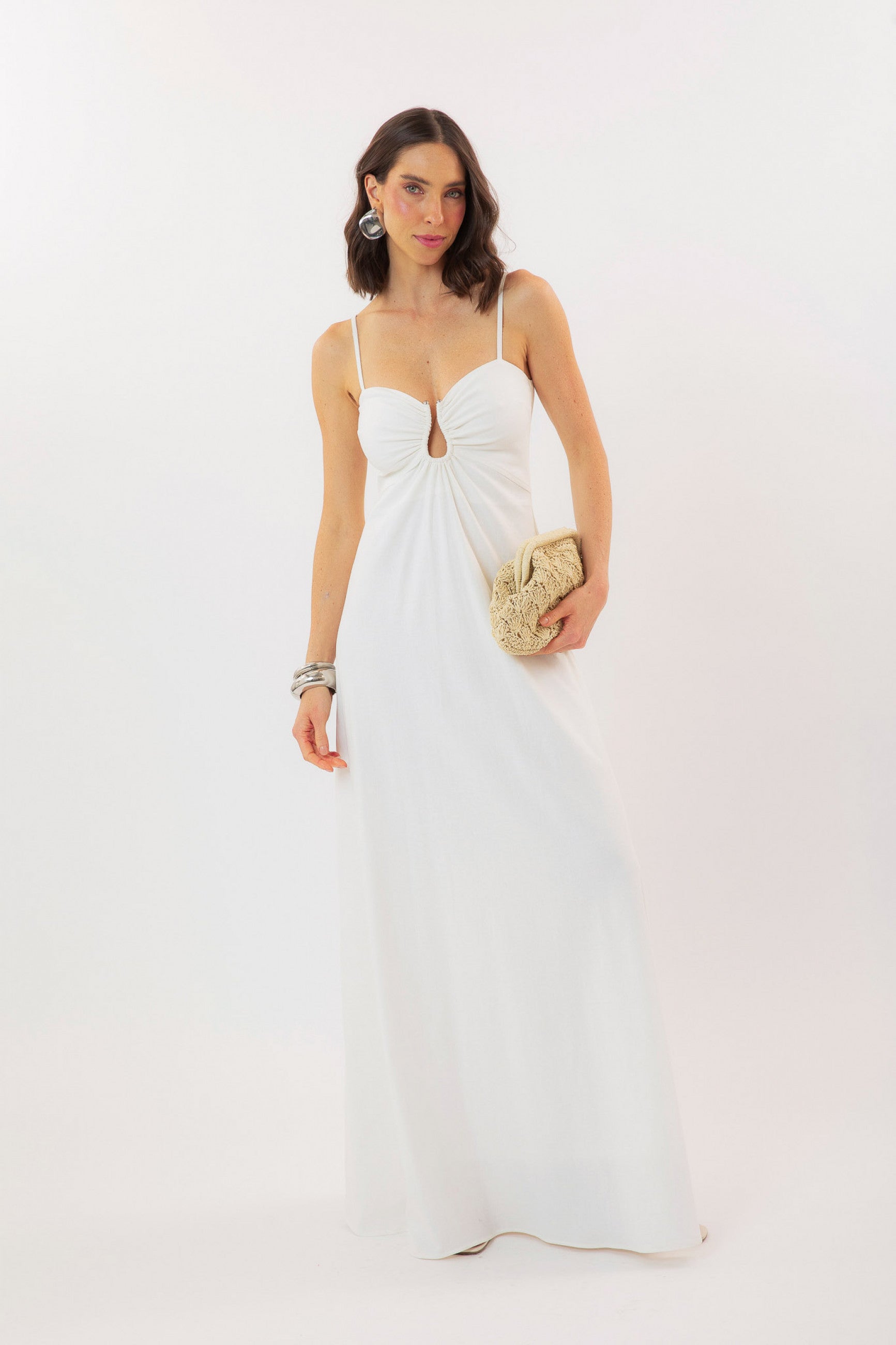 Long dress crafted from Linen Rayon Classic fabric. It features thin adjustable straps with metal regulators for a perfect fit. The bodice showcases a sweetheart neckline with a ruched detail and a central cutout adorned with metallic trim, adding a delicate and modern touch to the piece. The back has smocked detailing for comfort and a better fit, along with an invisible zipper closure. The skirt has a relaxed silhouette with an elegant drape, making it ideal for feminine and sophisticated looks.