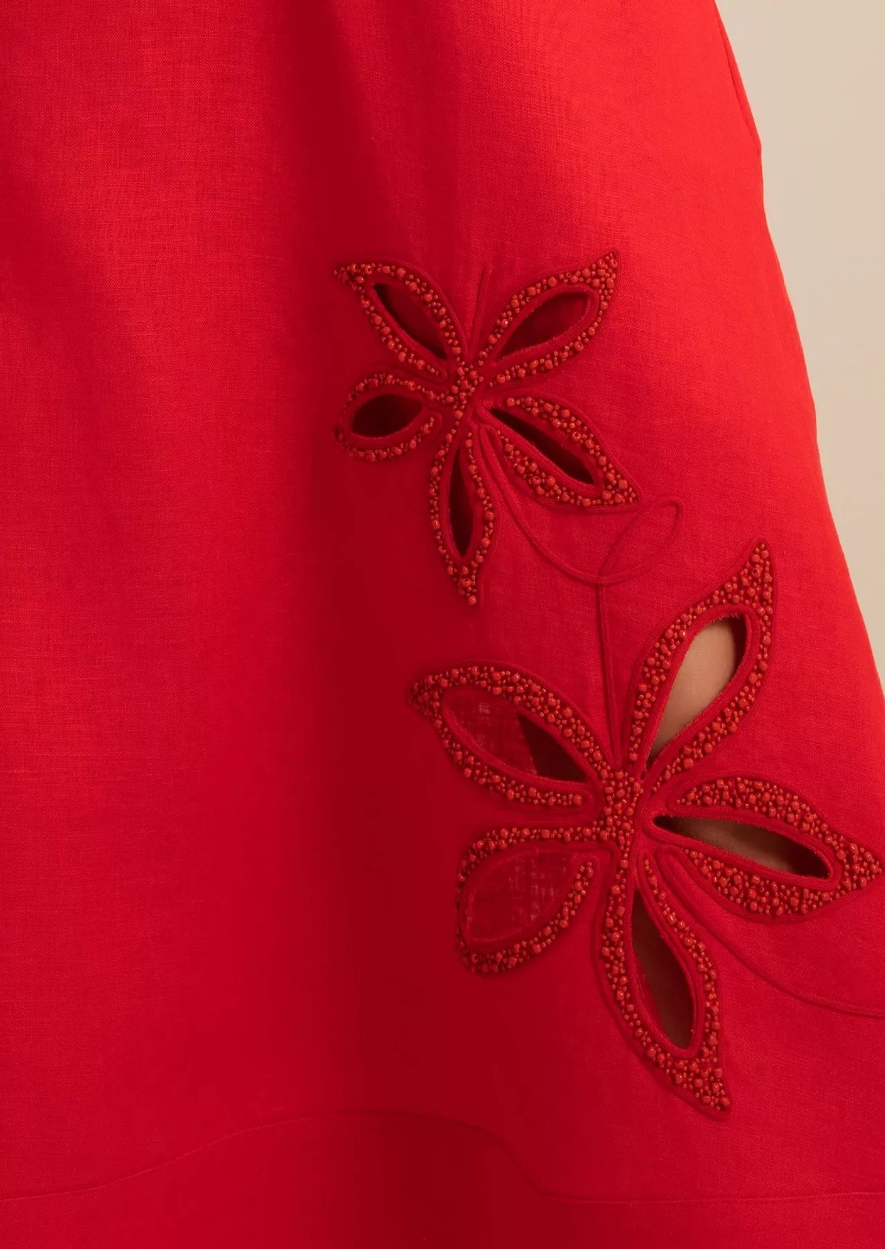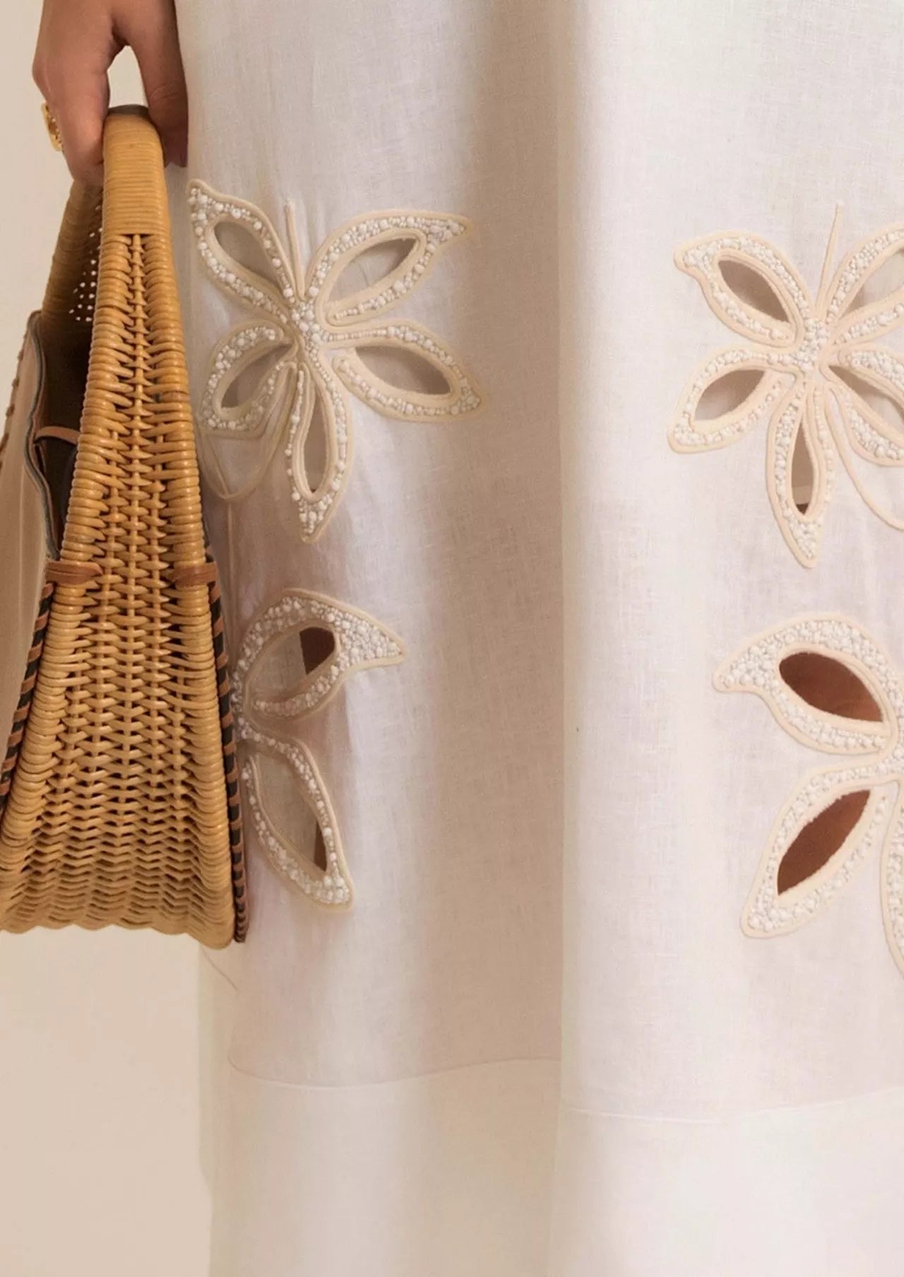 The entire piece is elevated by exquisite artisanal detailing floral embroidery along the hemline crafted with laser-cut technique and delicate ballerina-style embellishments adorned with explosion-effect beads, creating a unique texture and subtle luminosity.