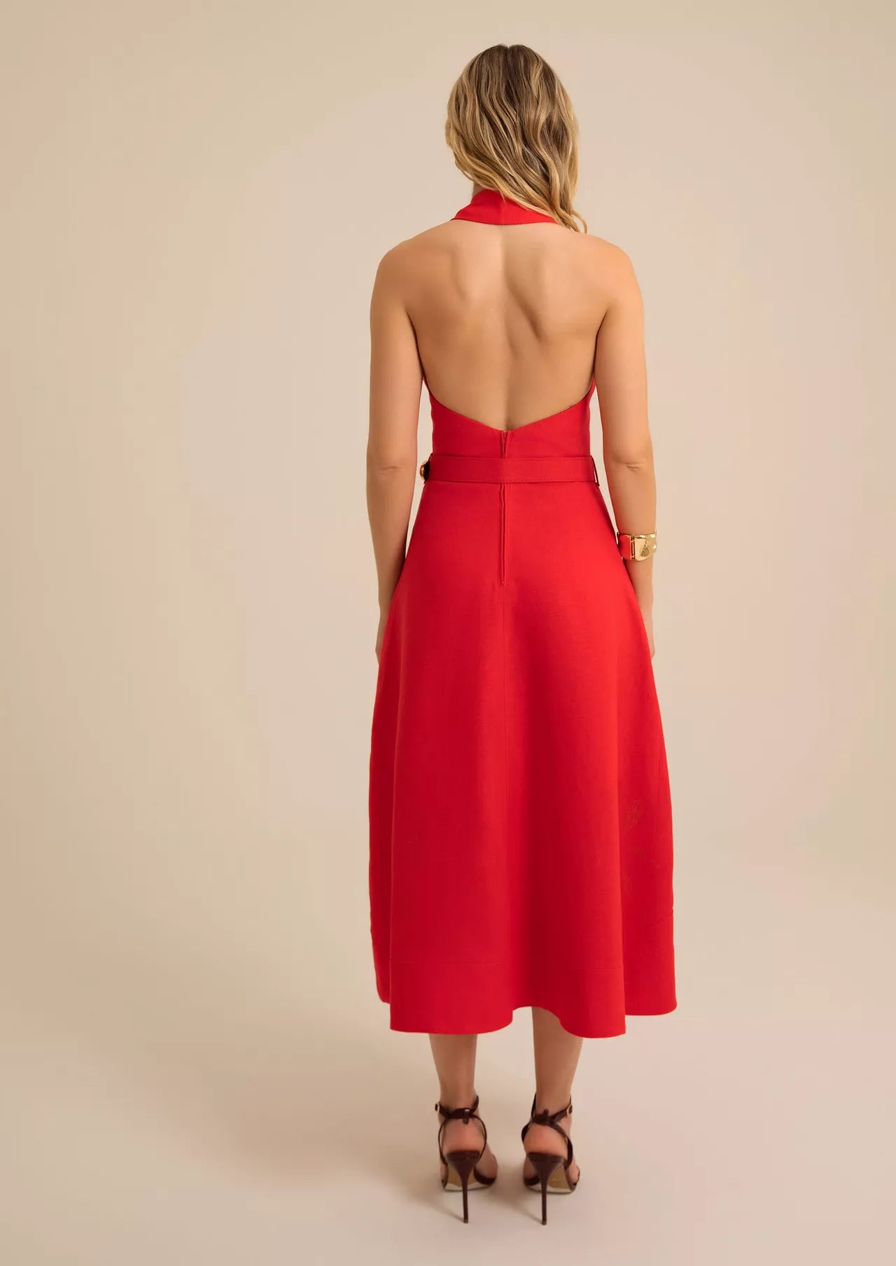 The halter-style midi dress features an A-line silhouette that creates elegant movement. The crossover front is enhanced by a structured yoke, while the waist is defined by a fabric-covered belt with a gold buckle that adds a touch of sophistication. The wide hemline and functional side pockets combine practicality with style.