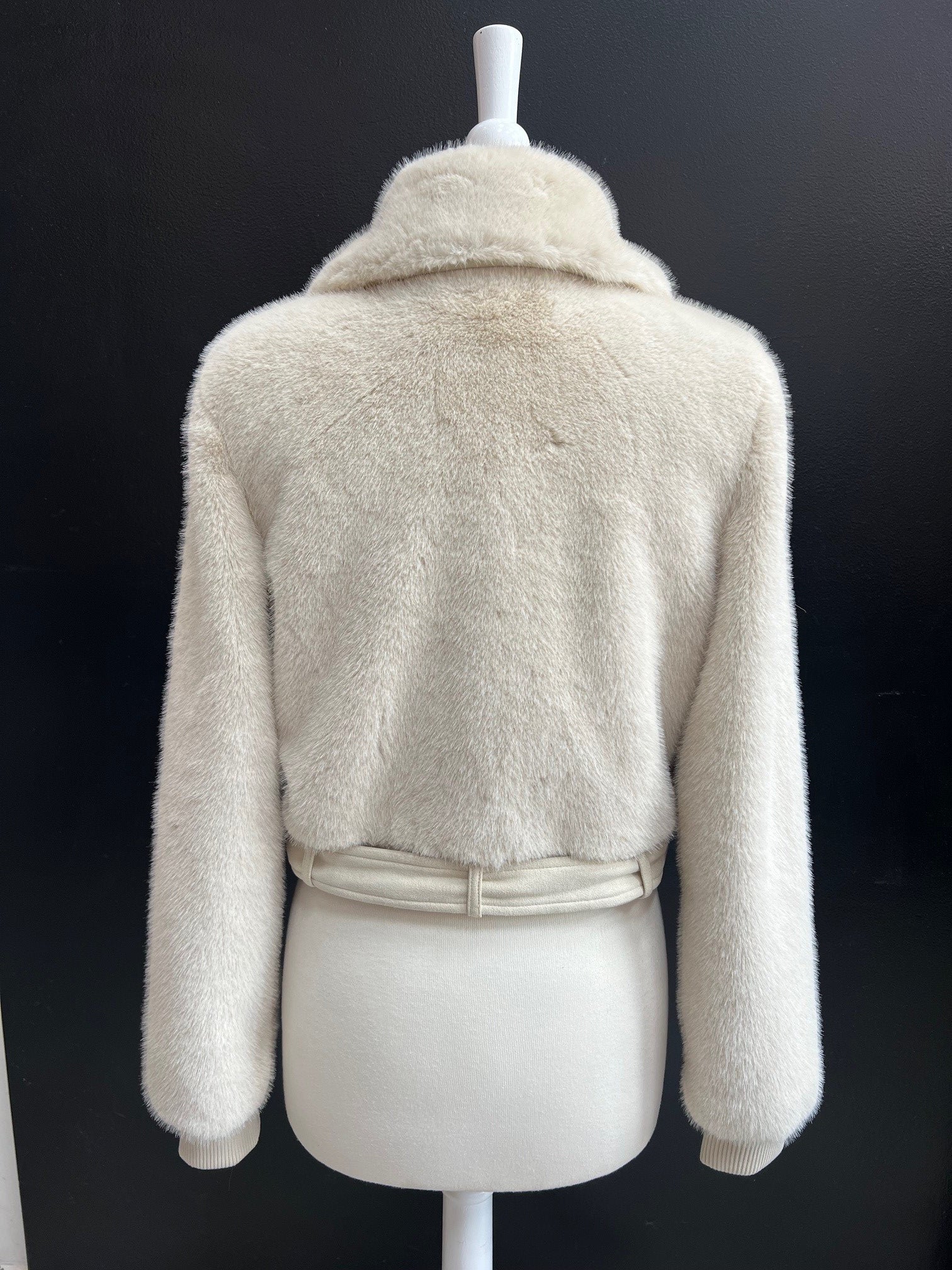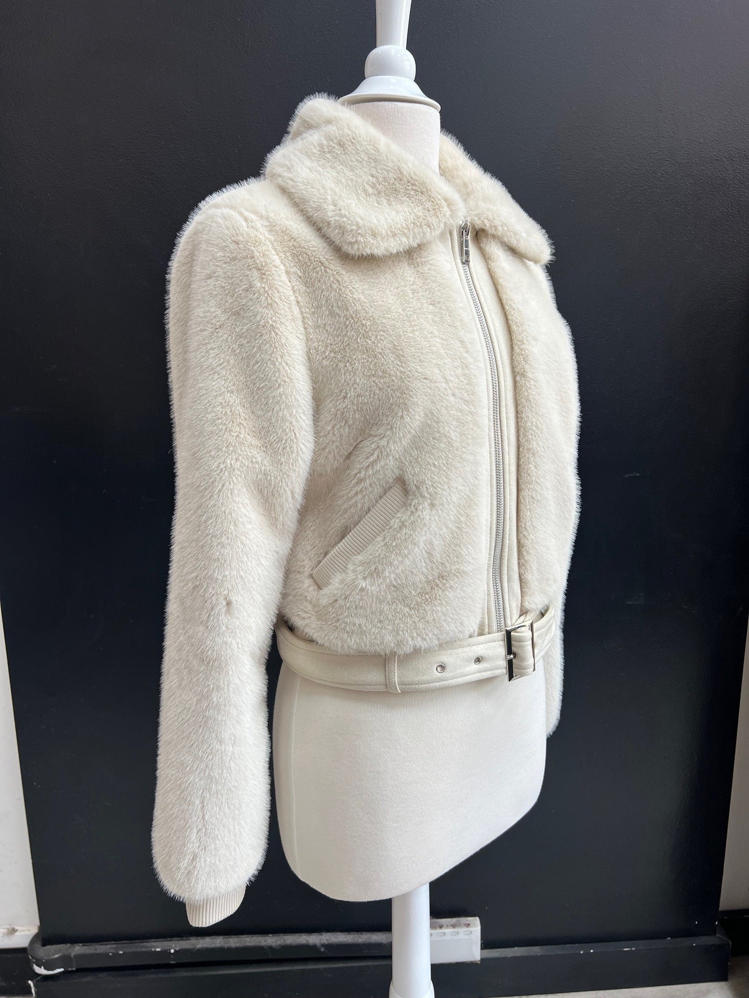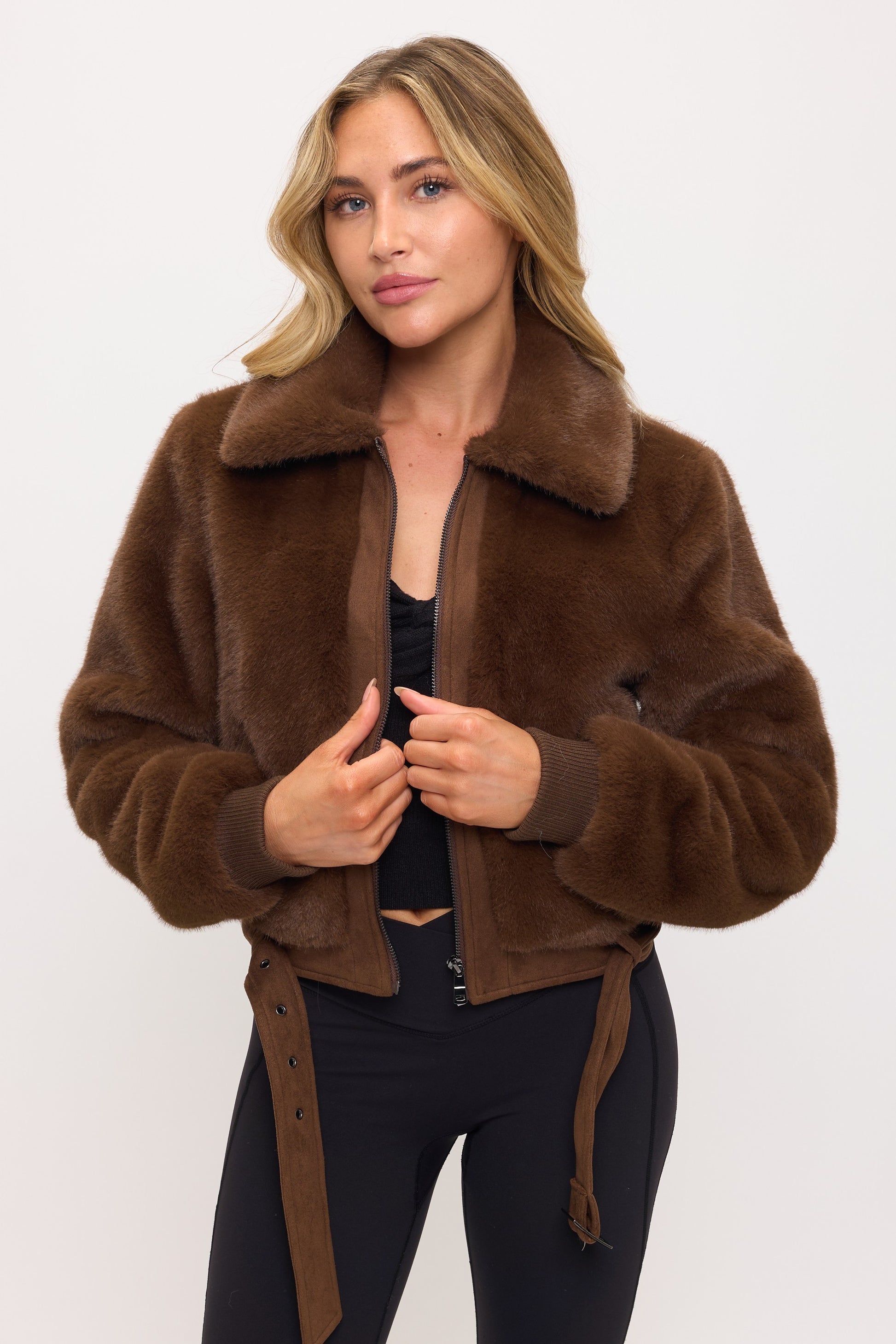 Command attention with this edgy cropped jacket that combines plush faux fur with tailored suede panels and bold belt hardware for a look of contemporary luxury. The structured zip-front design adds athletic sophistication, while the oversized proportions bring comfort and striking visual appeal.