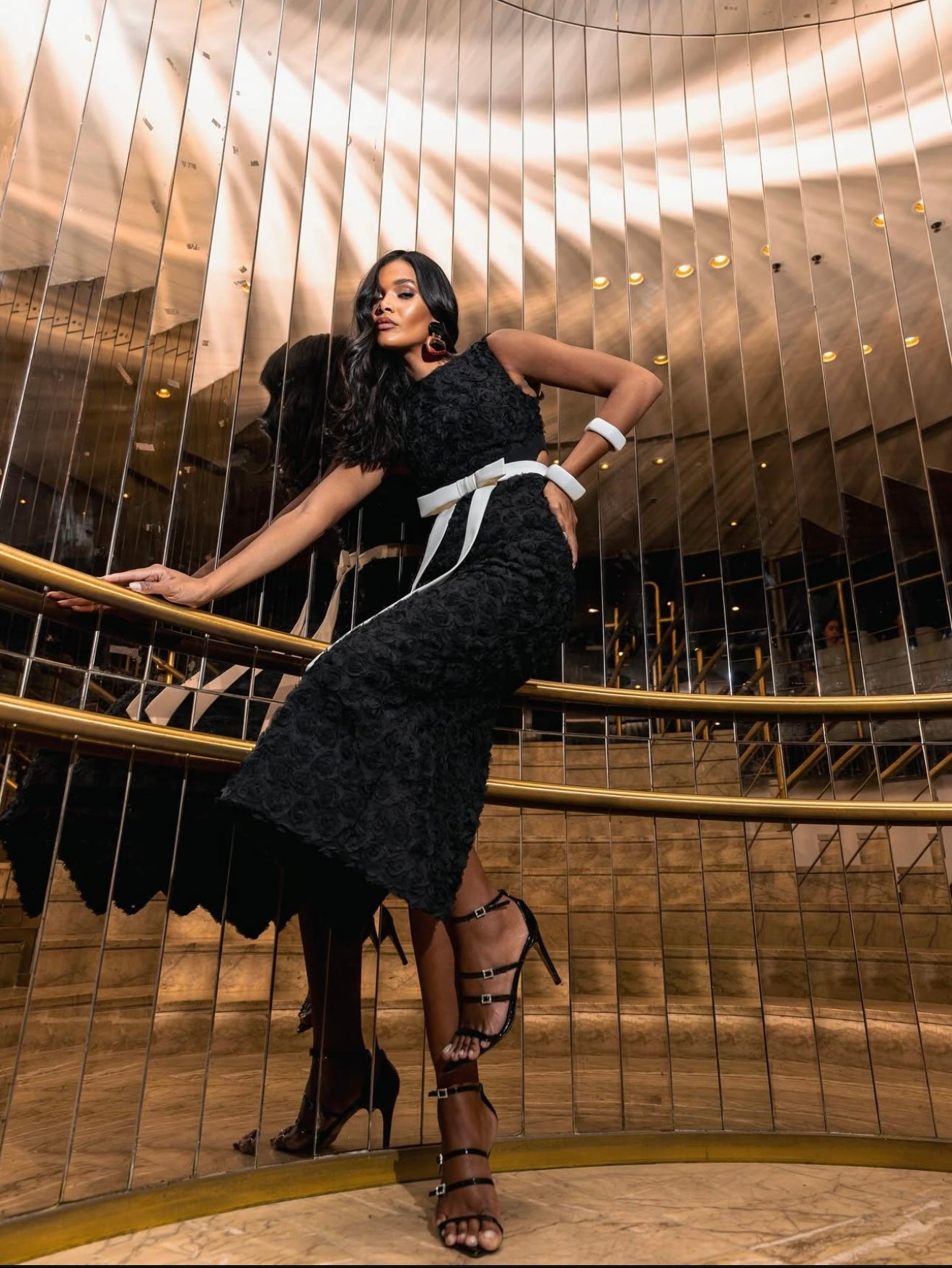 Elegant black midi dress crafted in a textured fabric with a refined, feminine silhouette. Designed with a removable bow belt, it offers versatile styling options wear it with the belt for a cinched waist and delicate detail, or without for a minimalist, sleek look. Perfect for evening occasions and special events.
