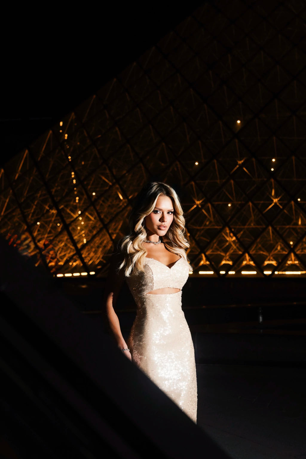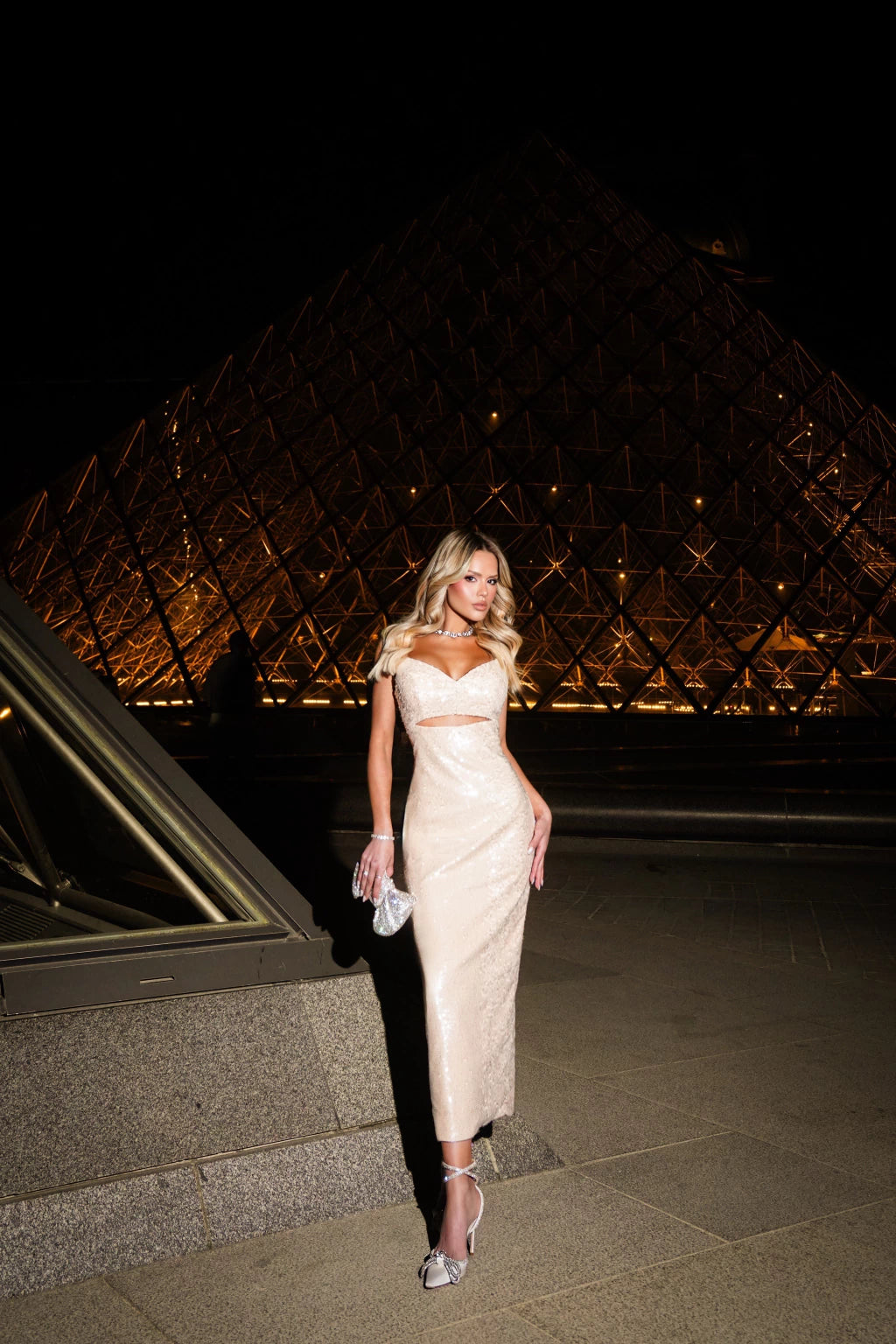Shine with effortless elegance in this dazzling midi dress, fully adorned with shimmering sequins. Featuring a flattering sweetheart neckline with delicate straps, it beautifully highlights the shoulders and décolleté. The subtle cutout detail below the bust adds a modern and alluring touch, enhancing the silhouette with sophistication. Designed in a sleek, body-skimming midi length, this dress is perfect for evening events, celebrations, and glamorous nights out. Pair it with refined accessories to complete a show-stopping look.