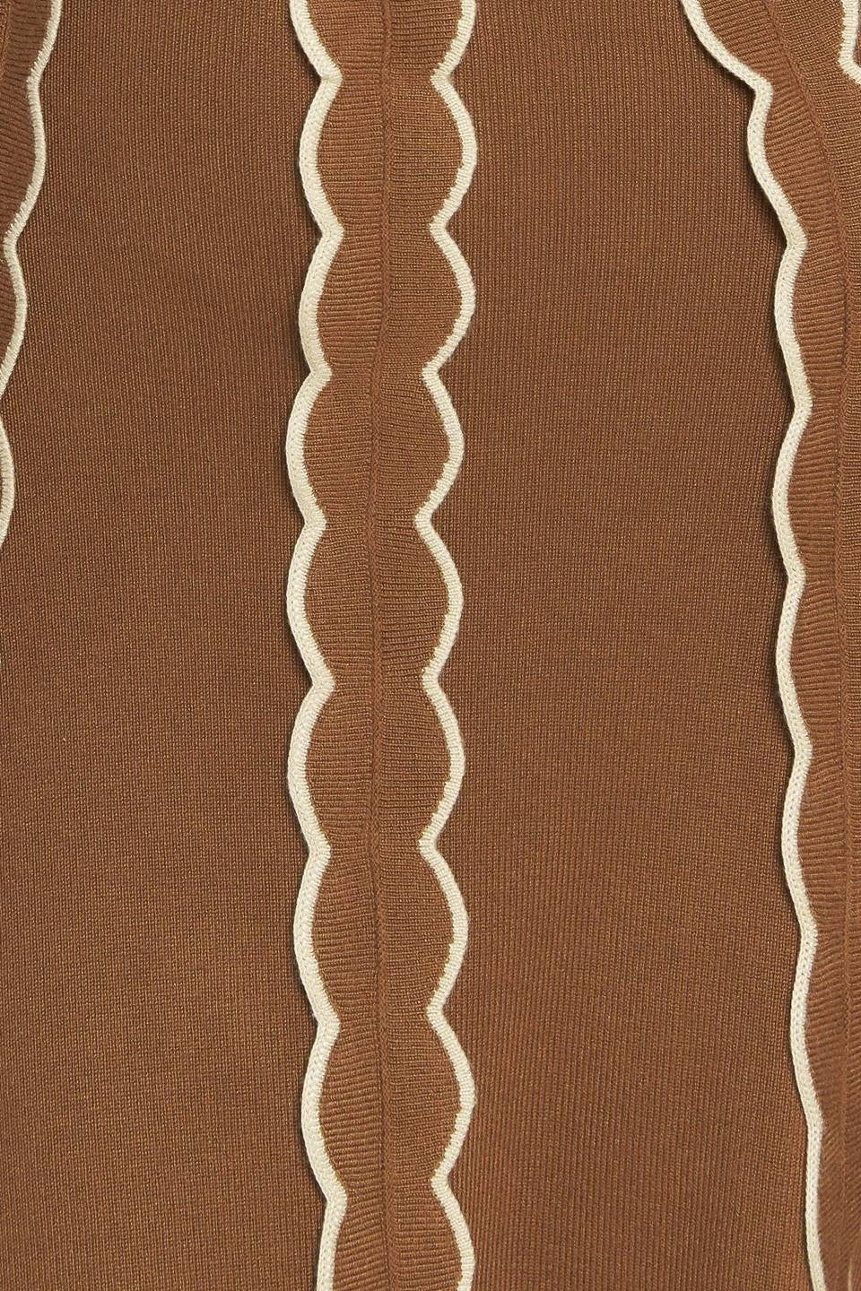 This sophisticated knit midi dress features a sleek halter neckline and a figure-flattering silhouette. Crafted from a comfortable, stretch-knit fabric, the design highlights the waist and flows gracefully through the skirt. Contrasting vertical wave detailing elongates the figure and adds a modern, refined touch. The rich brown tone brings warmth and elegance, making this dress ideal for day-to-night occasions, from casual chic outings to elevated events. A timeless piece that combines comfort, femininity, and contemporary style.