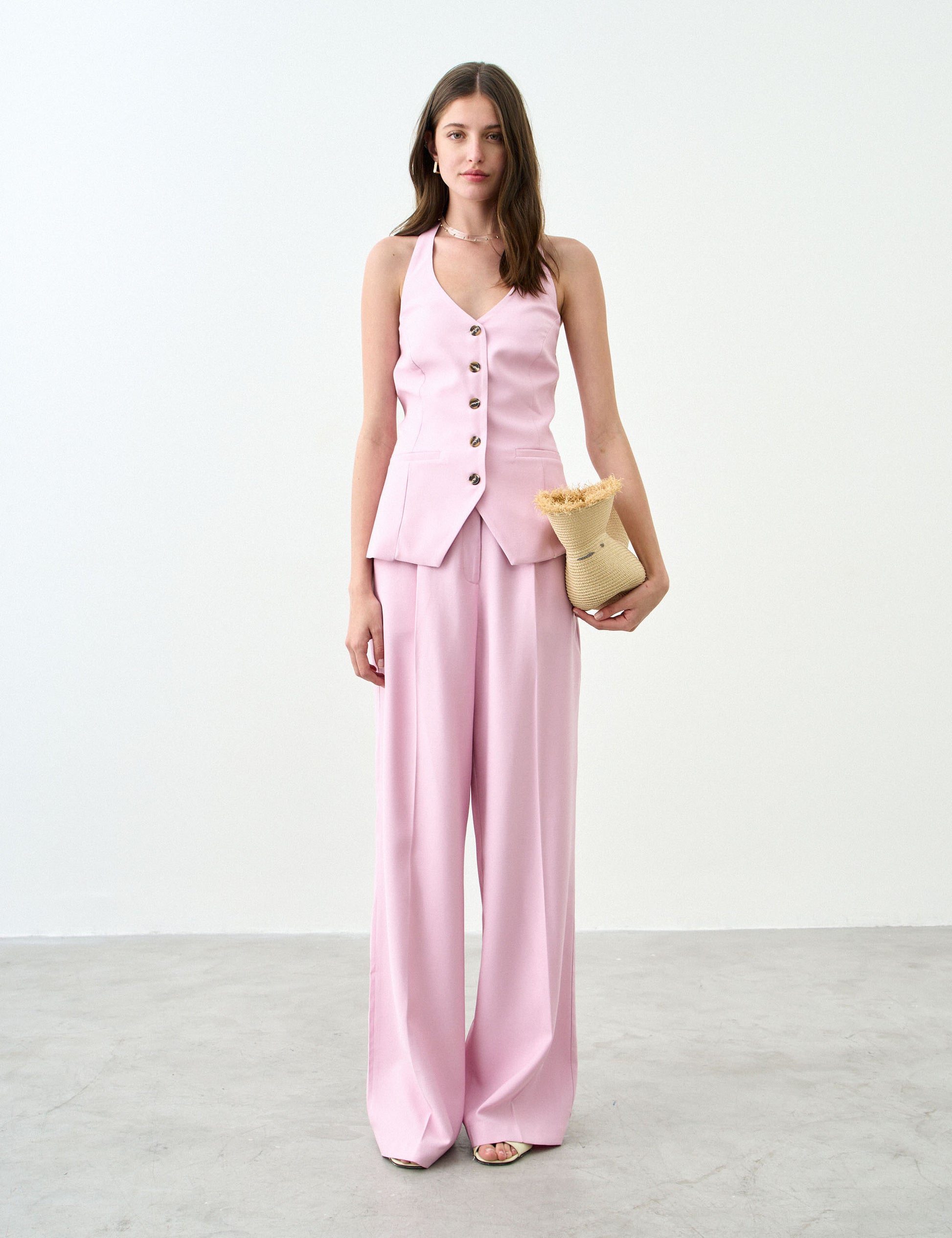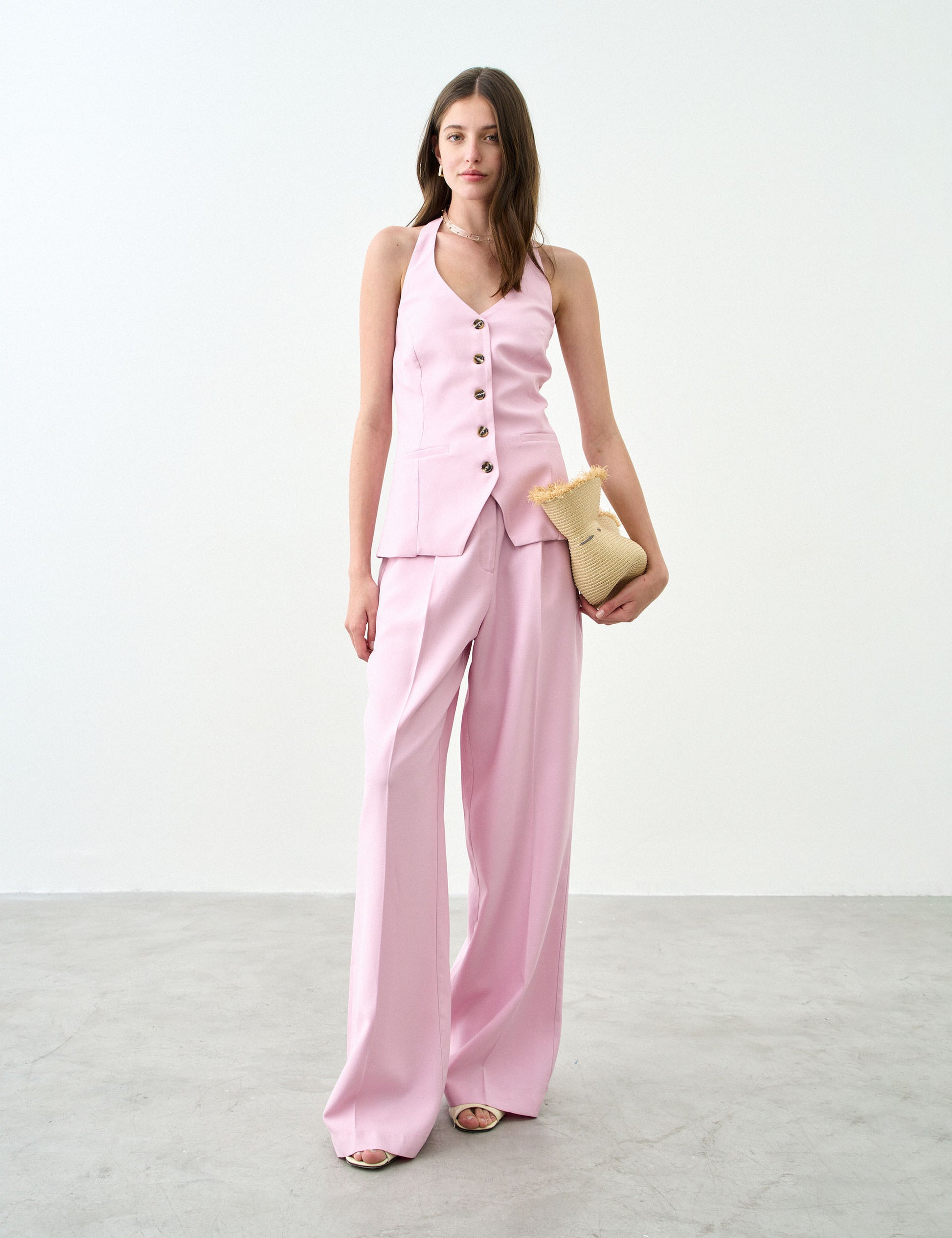 The design features a waistband with belt loops, zipper and button closure, and concealed placket for a clean finish. Front pleats and back darts create a refined fit, while side slash pockets add everyday functionality. The wide-leg shape ensures freedom of movement with a polished, tailored look.