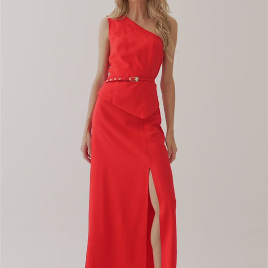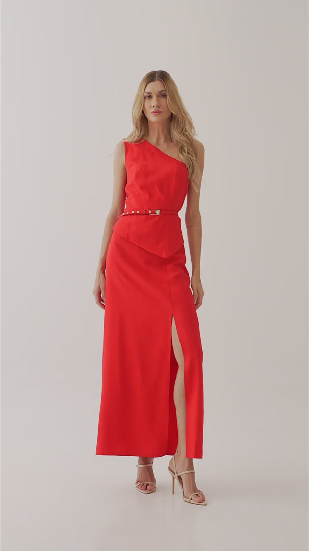 This sophisticated midi dress is crafted from a viscose-blend tailoring fabric that offers structure and elegance. Designed with an asymmetrical overlapping one-shoulder neckline, it exudes modern femininity and refined style. The accompanying belt accentuates the waist, enhancing the silhouette, while the clean lines and flawless tailoring make it perfect for both formal events and evening occasions.