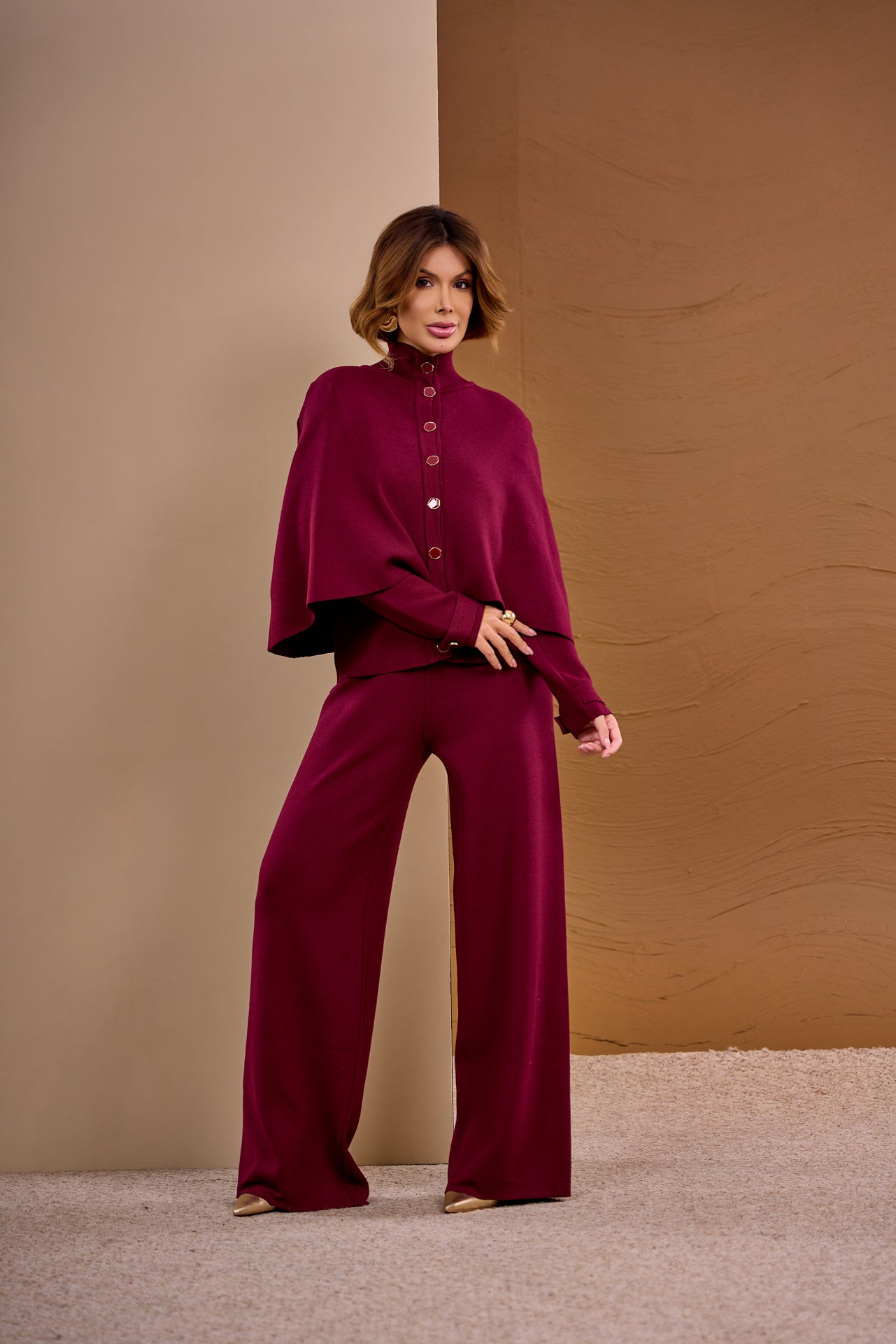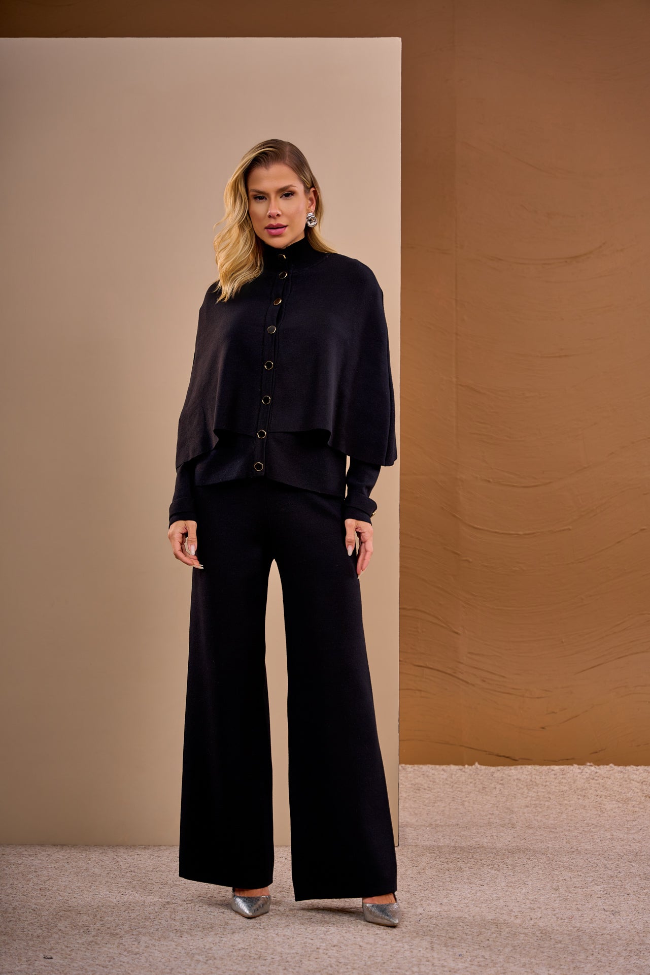 Elegantly designed, this cape-style knitted cardigan brings a perfect blend of comfort and sophistication. Featuring a structured high neckline and a front button placket, the piece offers a refined silhouette while maintaining a relaxed, fluid fit through the upper body. The layered effect created by the cape overlay adds movement and visual interest, making it a standout piece for styling with trousers, skirts, or even layering over dresses.