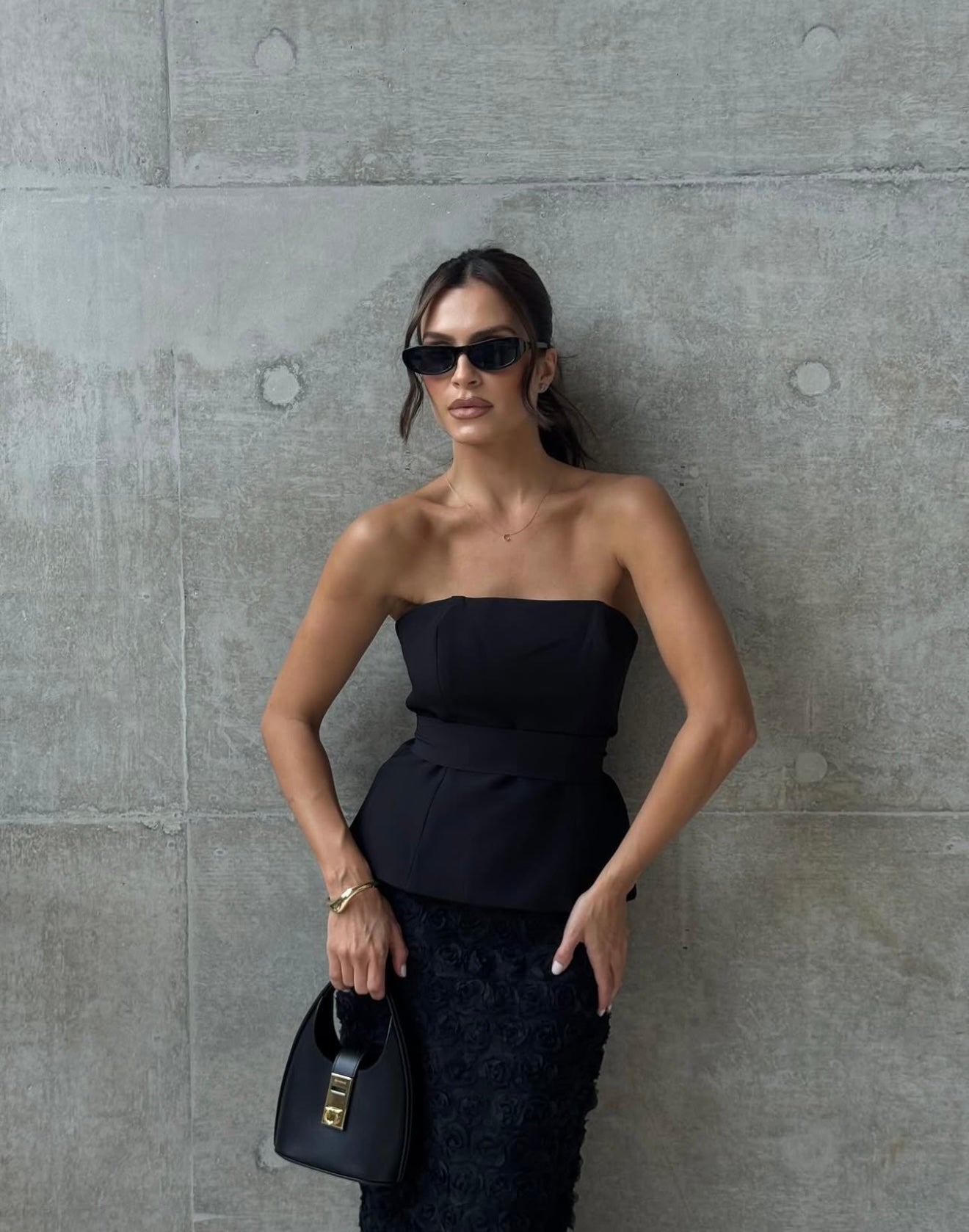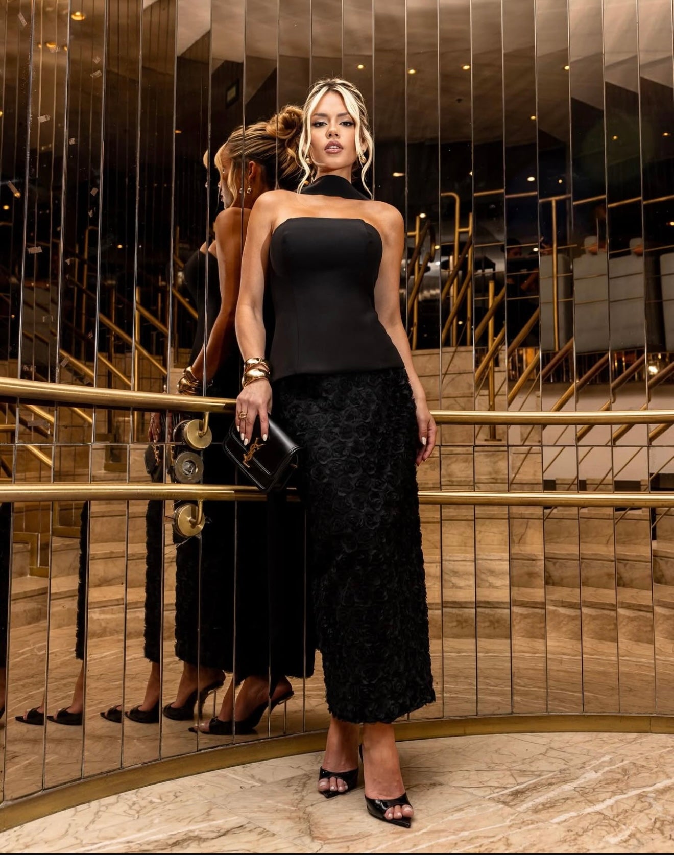 Sophisticated and versatile, this two-piece set features a structured top paired with a textured midi skirt. The look is elevated by a detachable band detail, which can be styled in multiple ways to create different outfits from a choker effect to a waist belt or even as a shoulder accent. Perfect for evening events, this set combines elegance with endless styling possibilities.