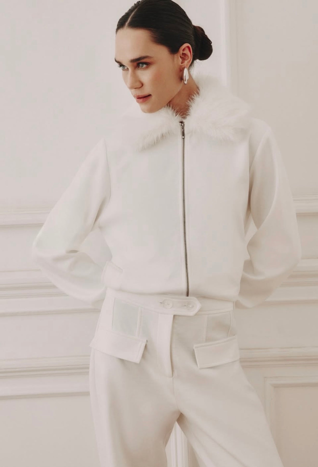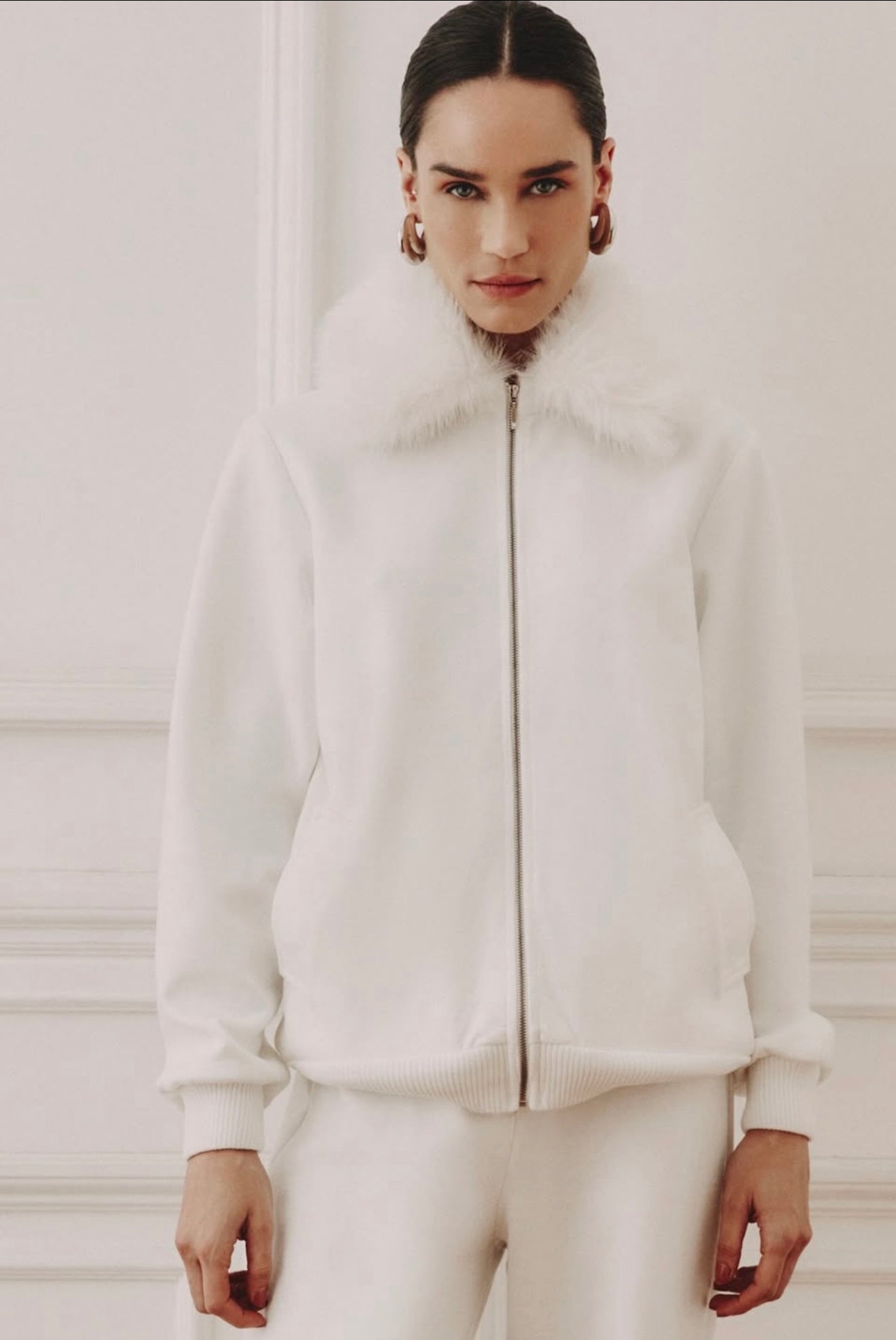 This refined set combines comfort and sophistication. The zip-up jacket features a soft faux fur collar and ribbed cuffs for a touch of luxury, paired with wide-leg knit pants that offer an effortlessly chic silhouette. Perfect for elevating everyday looks or traveling in style, this ensemble brings modern elegance to cozy dressing.