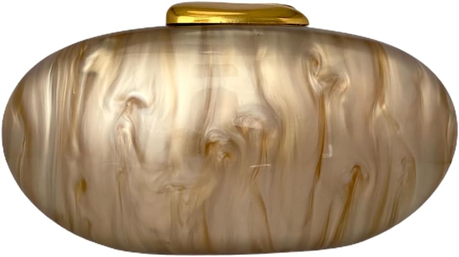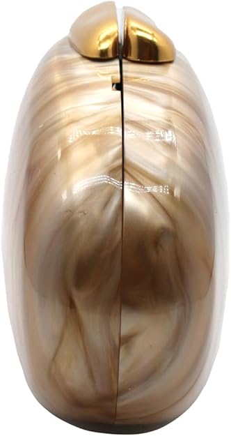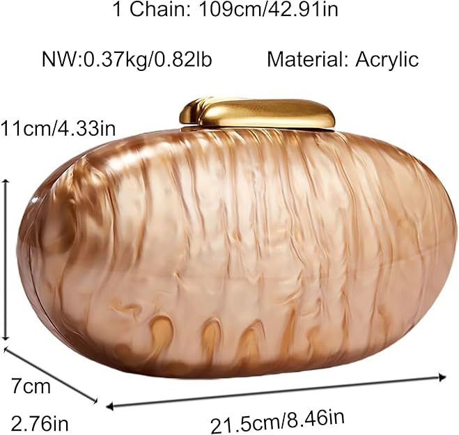 This flat oval acrylic clutch features an asymmetrical organic clasp that adds a modern and elegant touch. Measuring 15 × 25 × 5 cm, it comes with a 60 cm shoulder strap, making it ideal for creating sophisticated and contemporary looks.